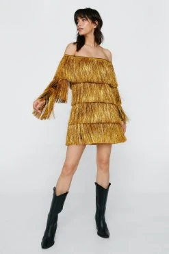 Bardot Long Sleeve Tinsel Fringe Mini Dress