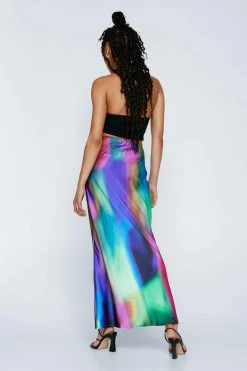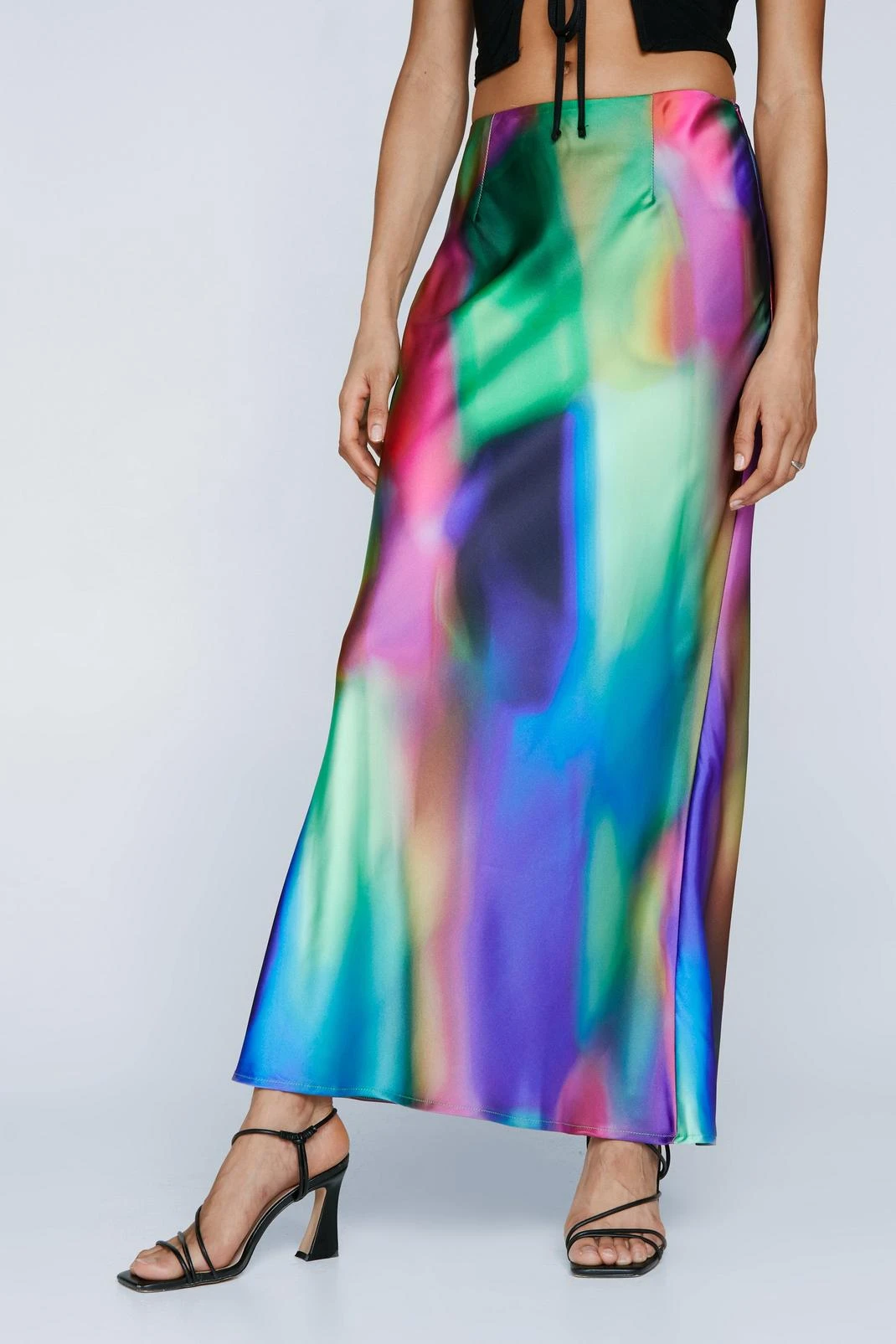 Skirt around it. Feel fierce when you step out in our bias maxi skirt, with high quality satin and a colorful abstract print that will turn heads as you strut the streets. Pairs well with a crop top and heels and will take you seamlessly from day to night.