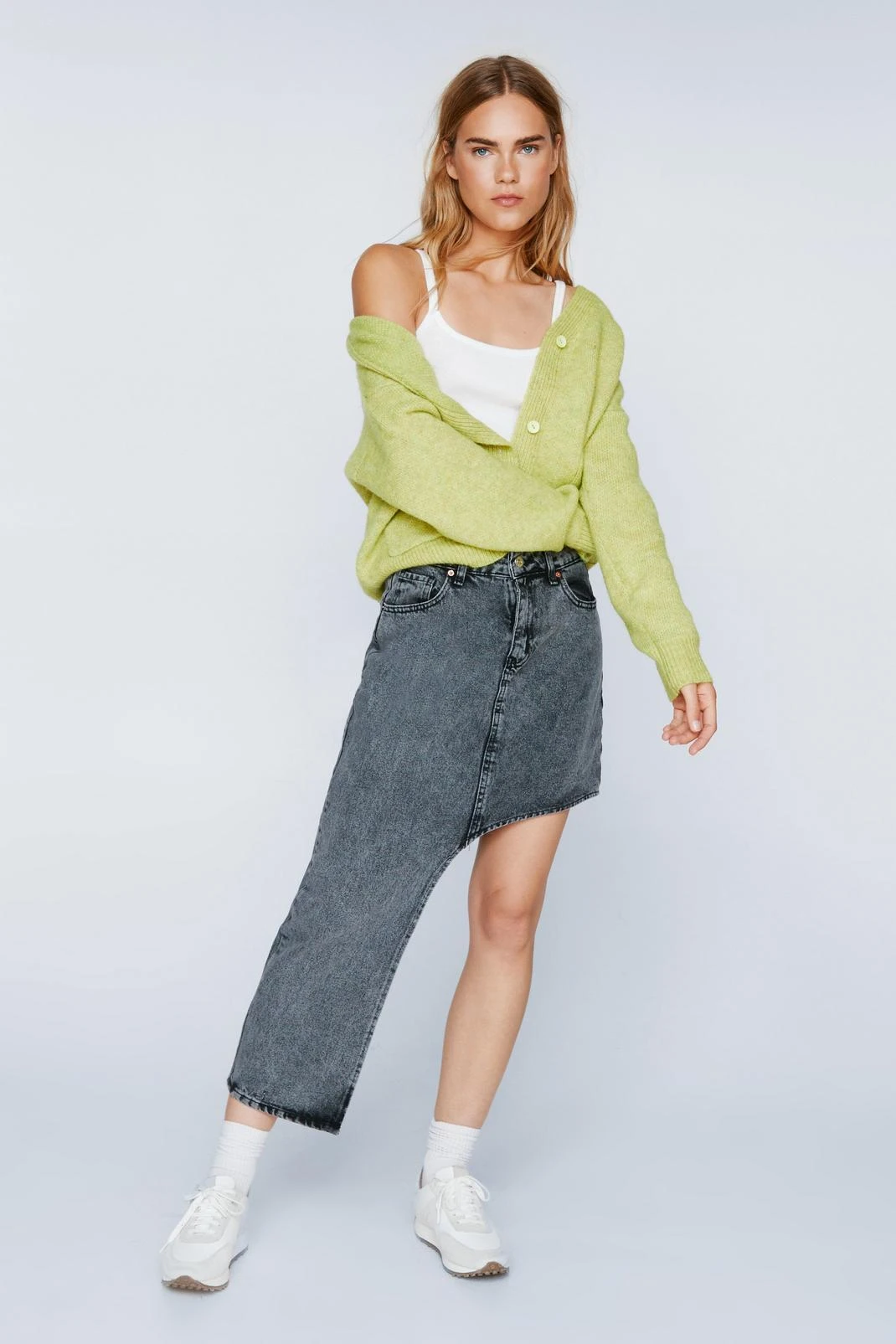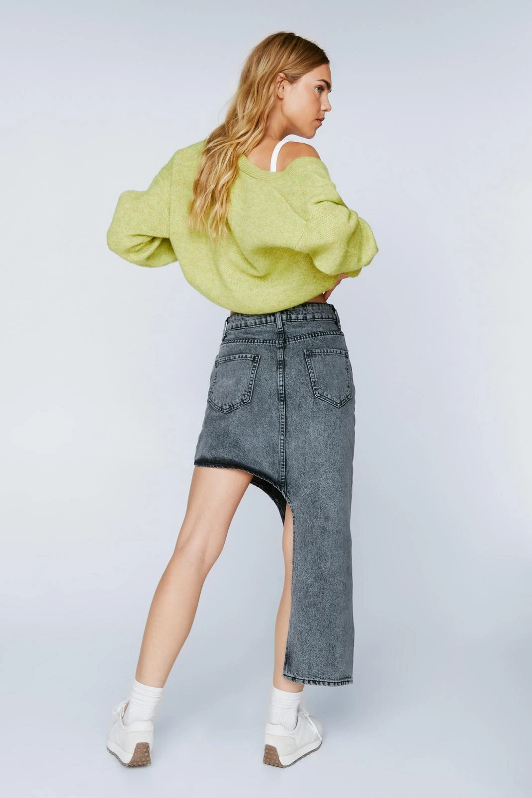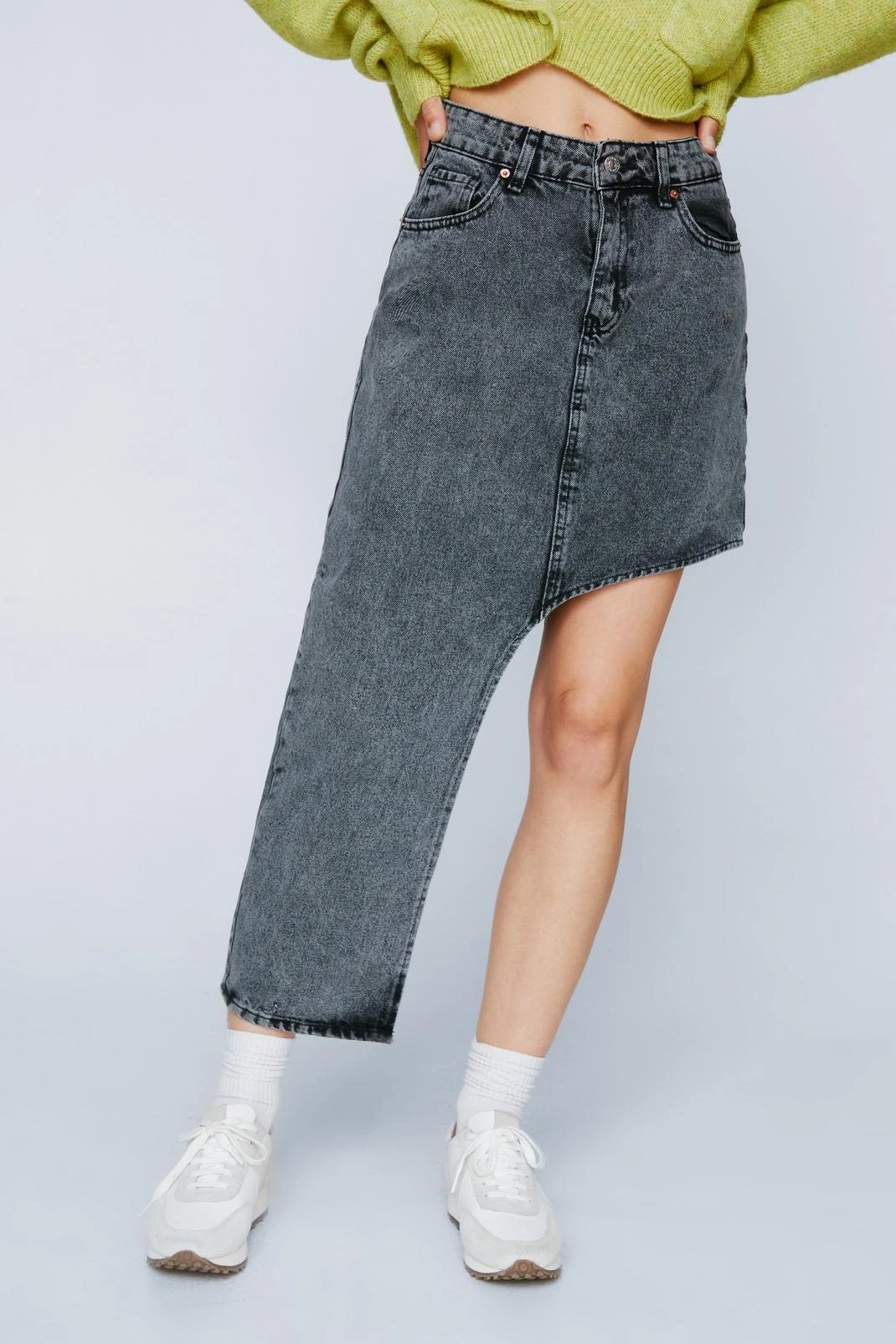 Dreamy denim. Wear our asymmetric longline denim skirt with a cropped sweater or crop top.