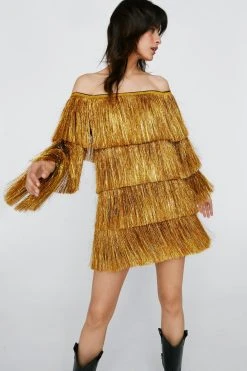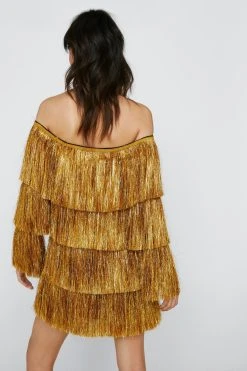 - Bardot Long Sleeve Tinsel Fringe Mini Dress