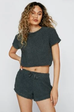 Cozy up. Feel cute in our two piece lounge set, made in high quality borg fabric, including a cropped T-shirt and high waisted shorts. Style with slippers for a lazy day look, or sneakers for a casual day out outfit.