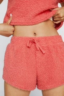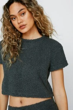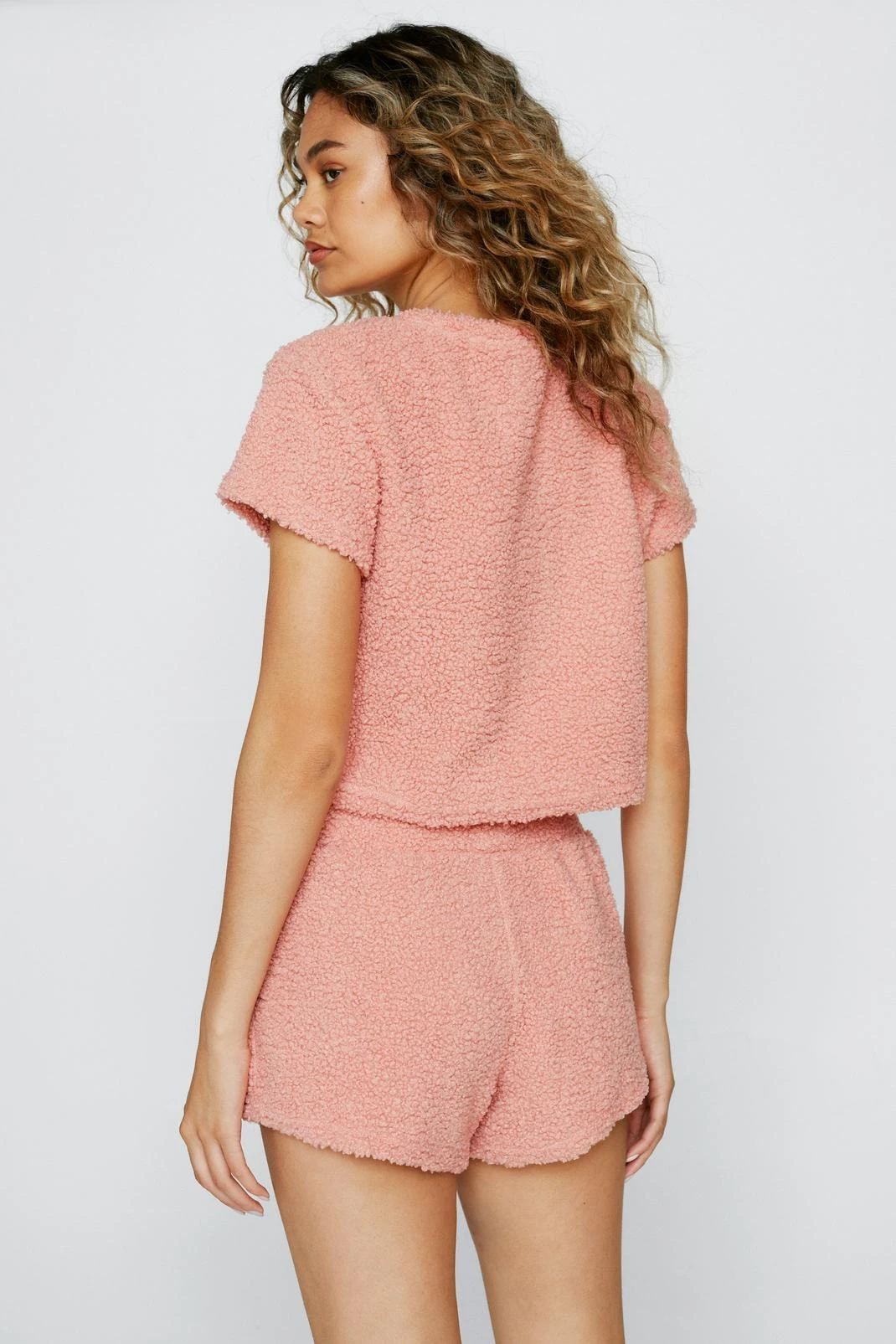 Cozy up. Feel cute in our two piece lounge set, made in high quality borg fabric, including a cropped T-shirt and high waisted shorts. Style with slippers for a lazy day look, or sneakers for a casual day out outfit.