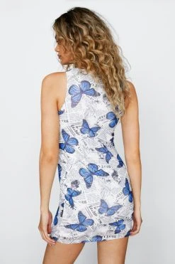 - Butterfly Print Mesh Racer Mini Dress