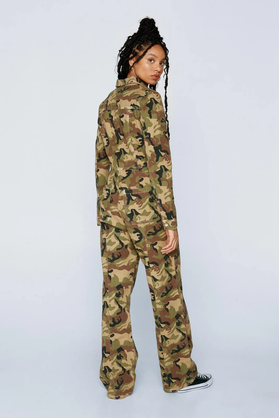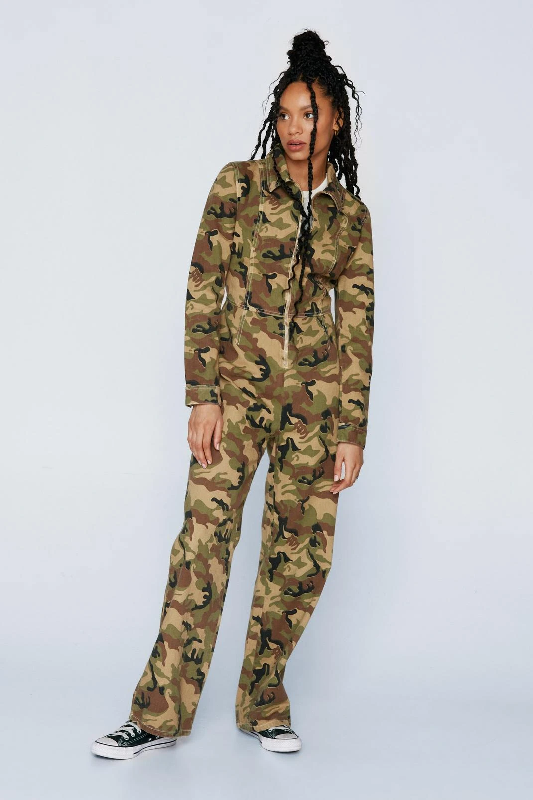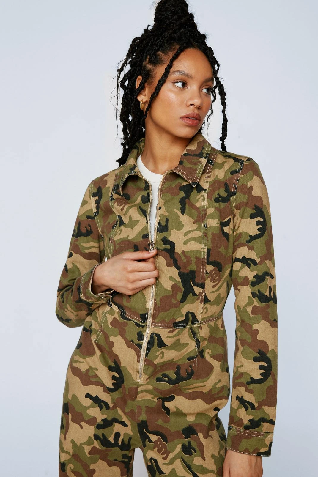 Jump in. Feel confident in our jumpsuit, made in high quality twill fabric, with an easy zip front fastening, and a classic camo print. Style with boots or sneakers for a look that will take you anywhere, from mall days to happy hours.