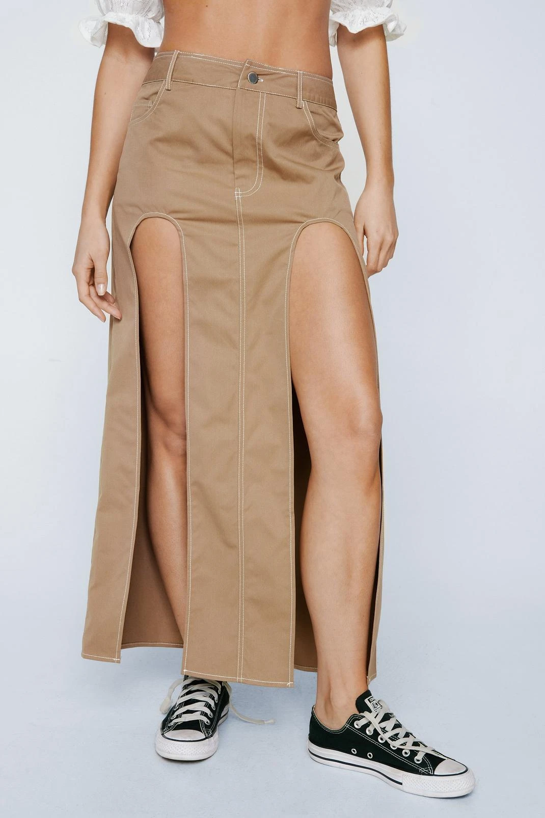 Turn heads. Feel fierce in our maxi skirt, with double thigh high leg cut outs and contrast stitching, with a handy pocket feature. Pairs well with the co ordinating bandeau top for a matching moment.