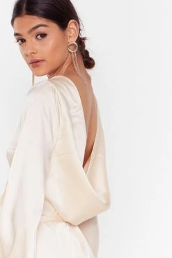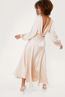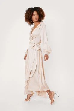 Or don’t. This dress comes in satin and features a wrap design, tie closure at side, maxi silhouette, and pleats at skirt.