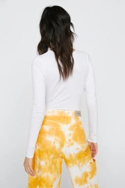 Replenish your capsule closet. This basic bodysuit comes in a ribbed jersey and features a fitted high leg silhouette, crew neckline, long sleeves, thong back, and snap closures at the crotch. A crucial layering piece to pair with denim, faux leather layers, and padded gilet jackets.