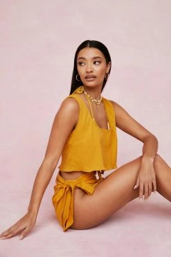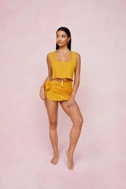Every day should be a vacay. The cover up top features a square neckline and relaxed, cropped silhouette. The matching cover up skirt features a high waisted, relaxed, mini silhouette and bow tie closure at side. Model is 5’9″ and wears a US size 6/UK size 10.