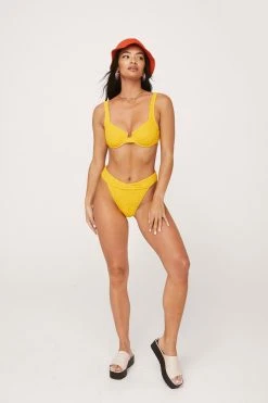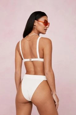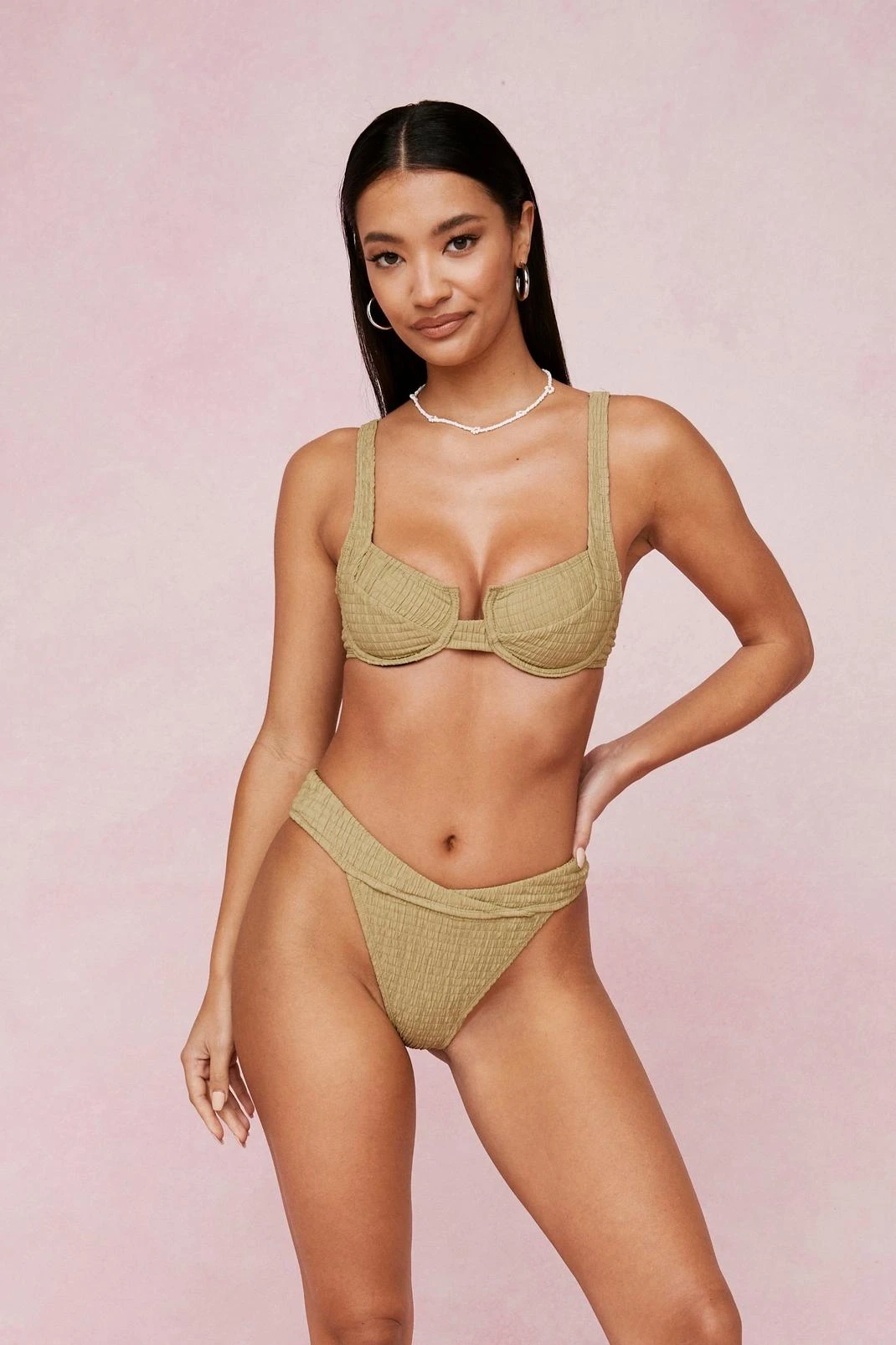 Tis the sea-son for rad swimwear, babe. This bikini top comes in a crinkled fabric and features an underwired, cupped design, and clasp closure at back. Model is 5’9″ and wears a US size 6/UK size 10.