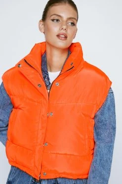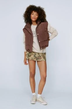 Add a layer. Feel cozy in our puffer vest, made in ultra thick padded fabric, with a zip and popper button fastening for extra protection from the elements, and a fun cropped length. Pairs well with sweaters and cargo pants for a cold day out look, perfect for wintery walks and coffee runs.