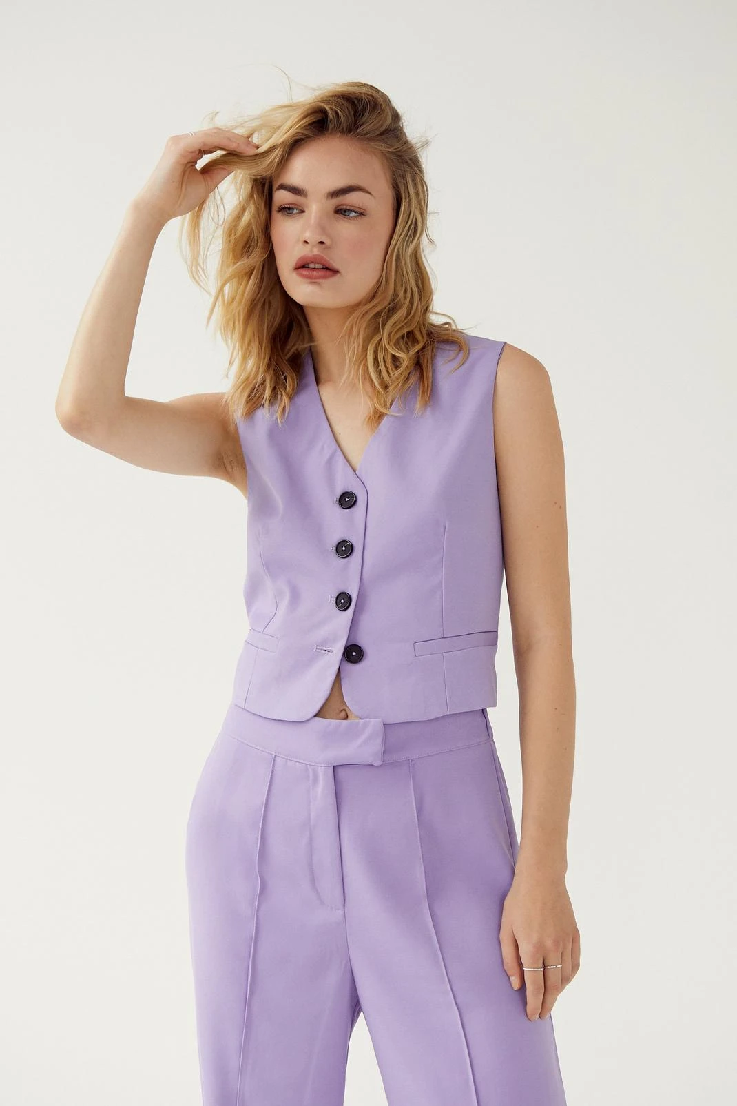 Suit season. This vest comes in a lightweight woven fabic and features a sleeveless design, tailored, cropped sillhoutte, V neckline, and tortoiseshell button down closures. Team yours with the matching wide leg pants and chunky sneakers. Item sold separate.