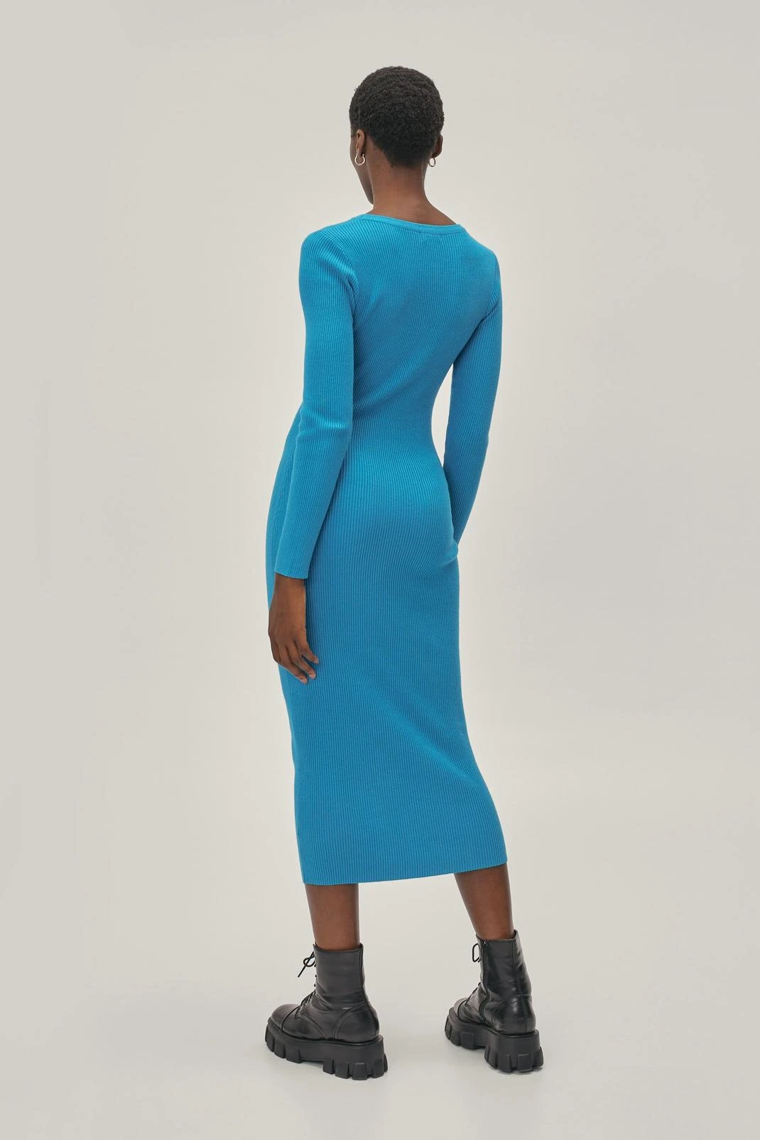 Get knit together. This dress comes in knit and features a 2 in 1, layered design at top, figure-fitting, midi silhouette, long sleeves, cut out at front, and stretch fit. Style up yours with chunky biker boots.
