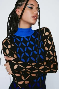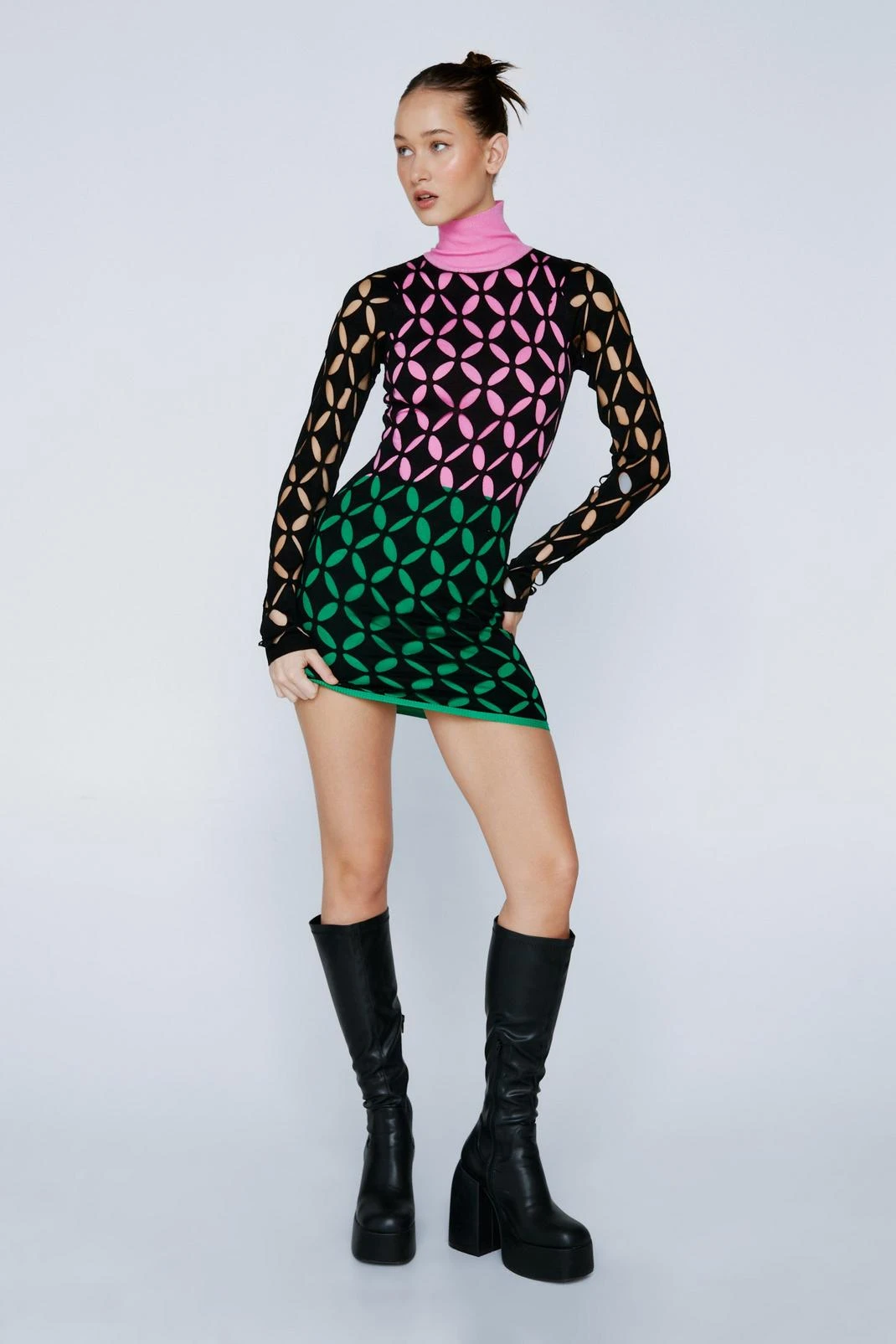 Elevated staples. Feel ready for the day – or night – ahead with our knit mini dress. Made in high quality knit fabric, with a colorful geometric pattern, ultra colorful underlays, and a high roll neck, this dress can easily be paired with boots or chunky heels for a look that will take you seamlessly from day to night. Perfect for dinner dates and drinks, happy hours, and casual parties.