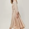 With shady beaches. This dress features a V-neckline at front and back, relaxed, midi silhouette, straps with bow tie closures, and tiered, ruffle detailing at skirt.