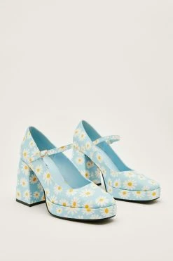 Daisy dreamer. These fun high heels feature a chunky platform heel, adjustable ankle strap, and enclosed toe. Style with a mini slip skirt and fluffy cardigan for a playful outfit.