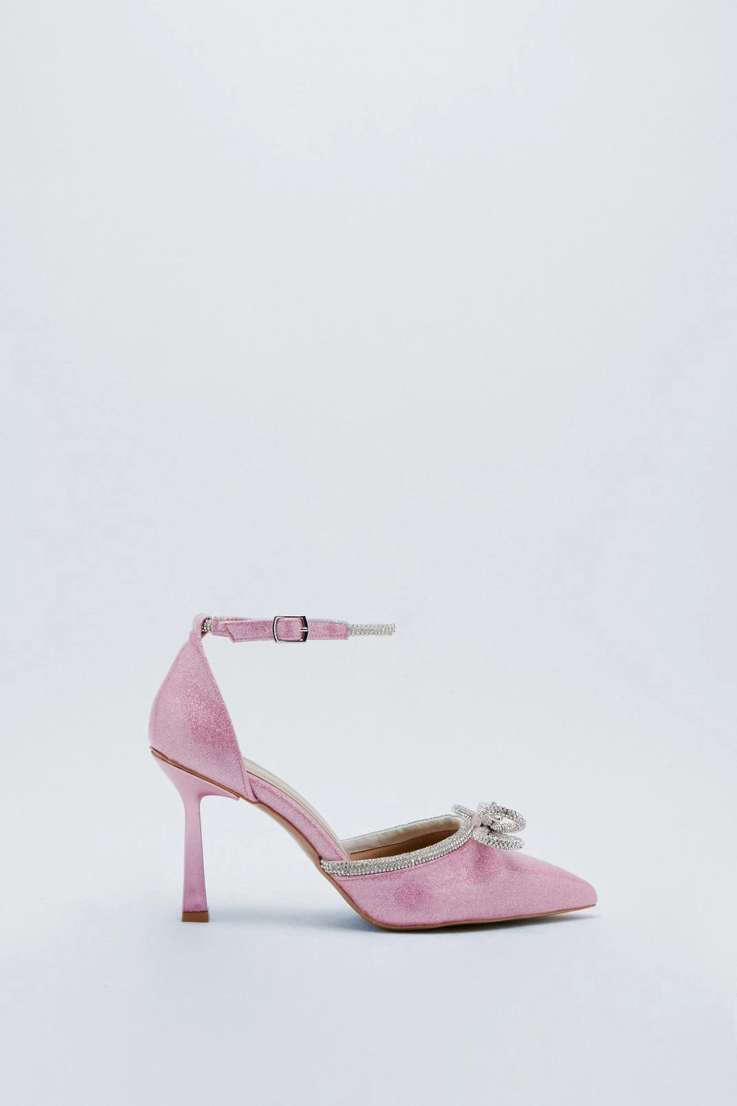 Steps that sparkle. These shoes feature pointed toes, enclosed heels, and diamante trim details. Team with a equally statement two-piece for a playful night out look.