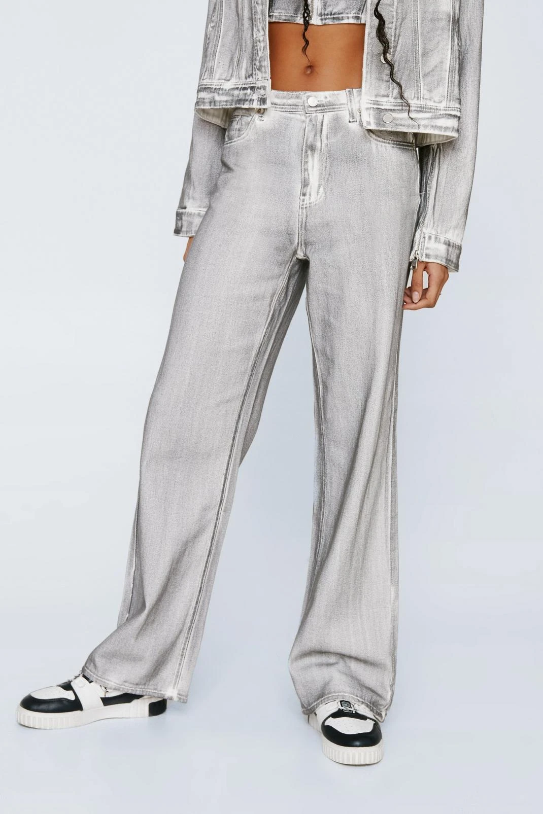 Time to reflect. Our distressed denim jeans with eye-catching metallic coating will have you feeling the ’90s fantasy. Style with the coordinating bralette and denim jacket for a matching moment.