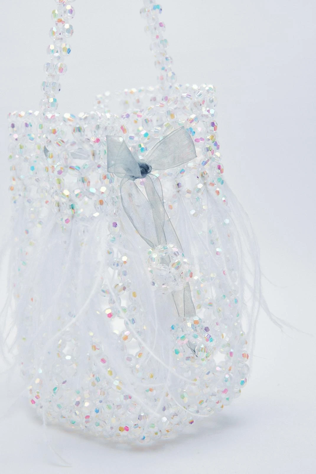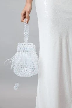 For holding your essentials. Add a little extra glamour in our beaded hand bag, with a shimmering, embellished beaded material, fun and flirty feather detailing, amd a short top handle. Pairs well with discoball dancefloors and party nights.
