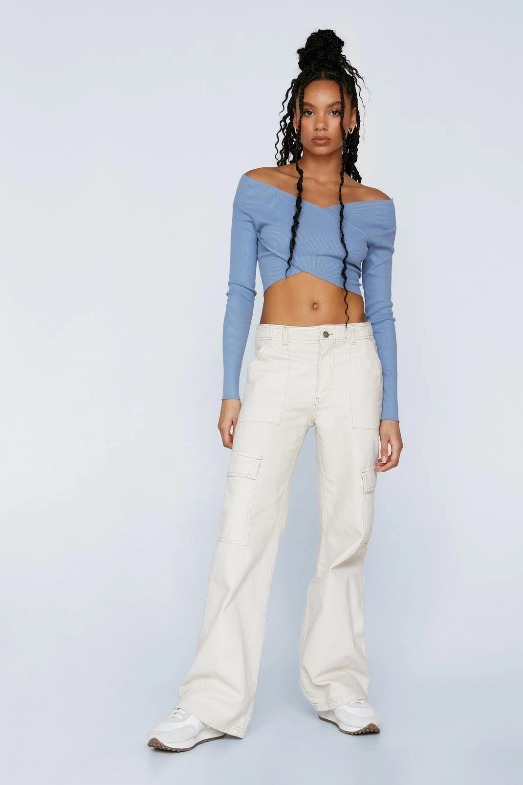 Elevated staples. Our exposed seam rib top will have you feeling great even in your everyday looks, with its flatting off the shoulder design and cropped length. Style with cargo pants or jeans for a casual daytime look, perfect for breakfast dates and coffee runs.