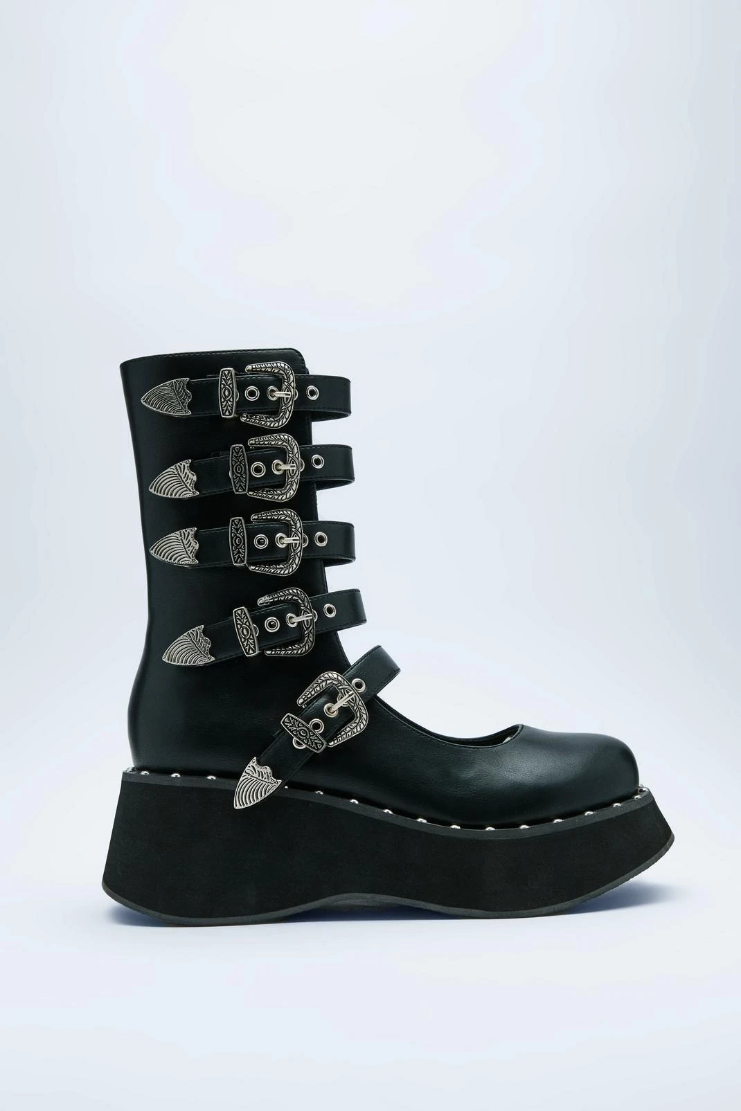 Step it up. Feel edgy in our ankle boots, made in a high quality faux leather, with buckle detailing and chunky platform soles. Pairs well with dresses and skirts, or can be worn under jeans for an instantly elevated look.