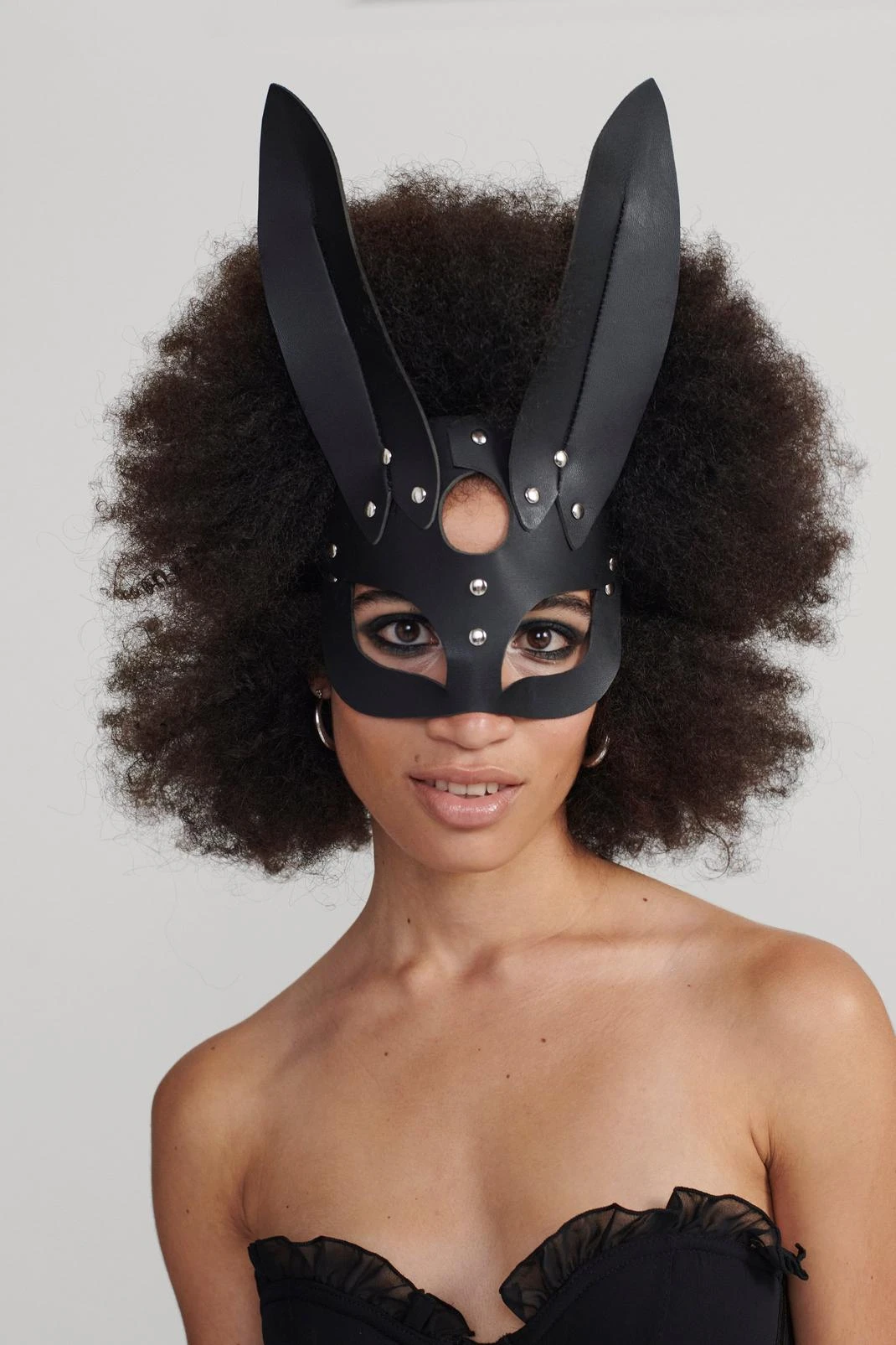 Costume calling. This mask comes in faux leather and features a bunny design and studded detailing. Throw on with an all black outfit and your costume is good to go.