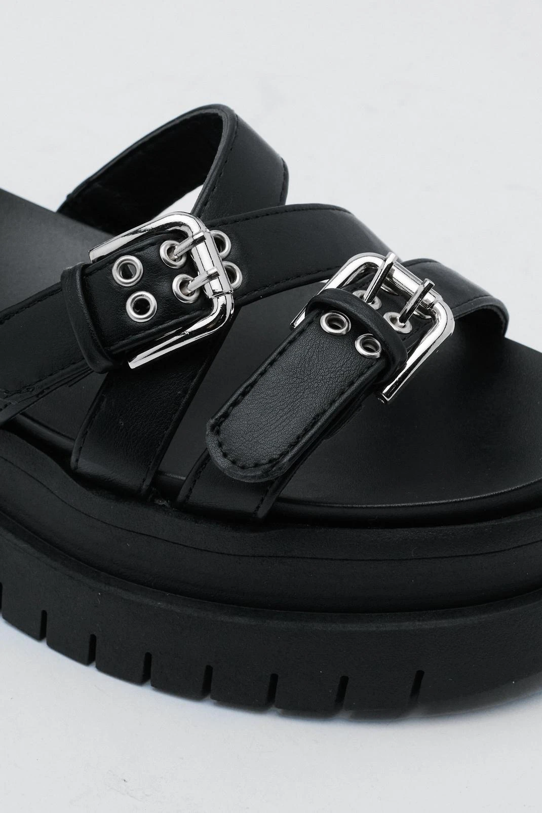 Cross it over. These sandals feature chunky soles, a strappy design, and exposed heels. Style with a denim mini skirt and racer crop top for casual coffees with friends.