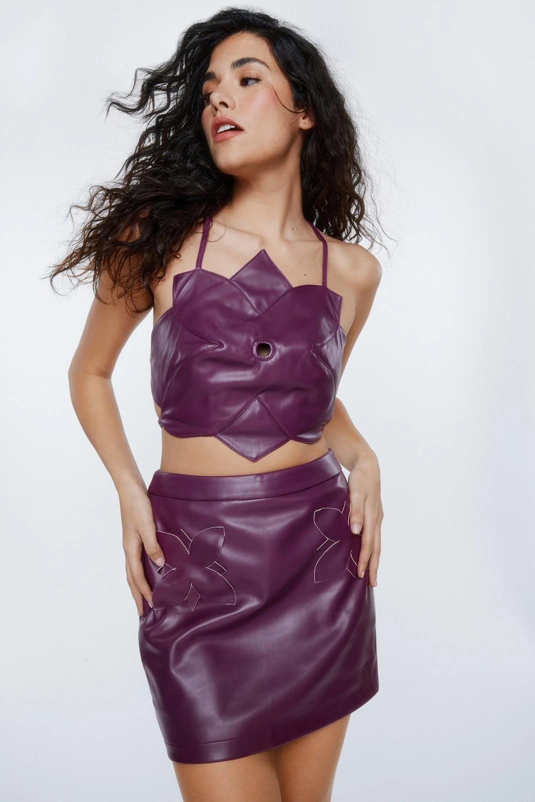 Going somewhere? Feel fierce in our mini skirt, made in high quality faux leather fabric, with a flattering high waistline and cute floral details. Pair with the matching top for a party night look, or with a crop top for a more casual approach.