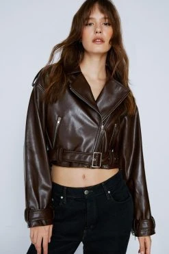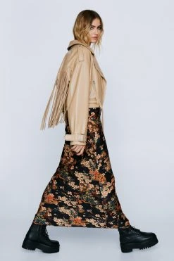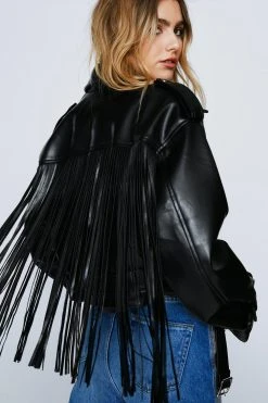 Pleather please. Feel protected from the cold without compromising on style in our faux leather jacket, with long fringe detailing for fun movement and a cropped length for an edgier approach. Pairs well with a crop top and jeans.