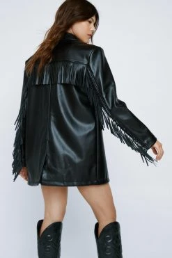Updated outer layers. Feel confident in our faux leather blazer, made in high quality faux leather, with a flattering relaxed, longline fit and a statement fringe accent. Pairs well with jeans and T-shirts for an elevated daytime look, or wear it over a mini dress for a layered night out look.