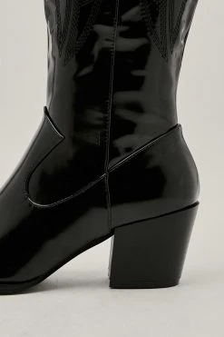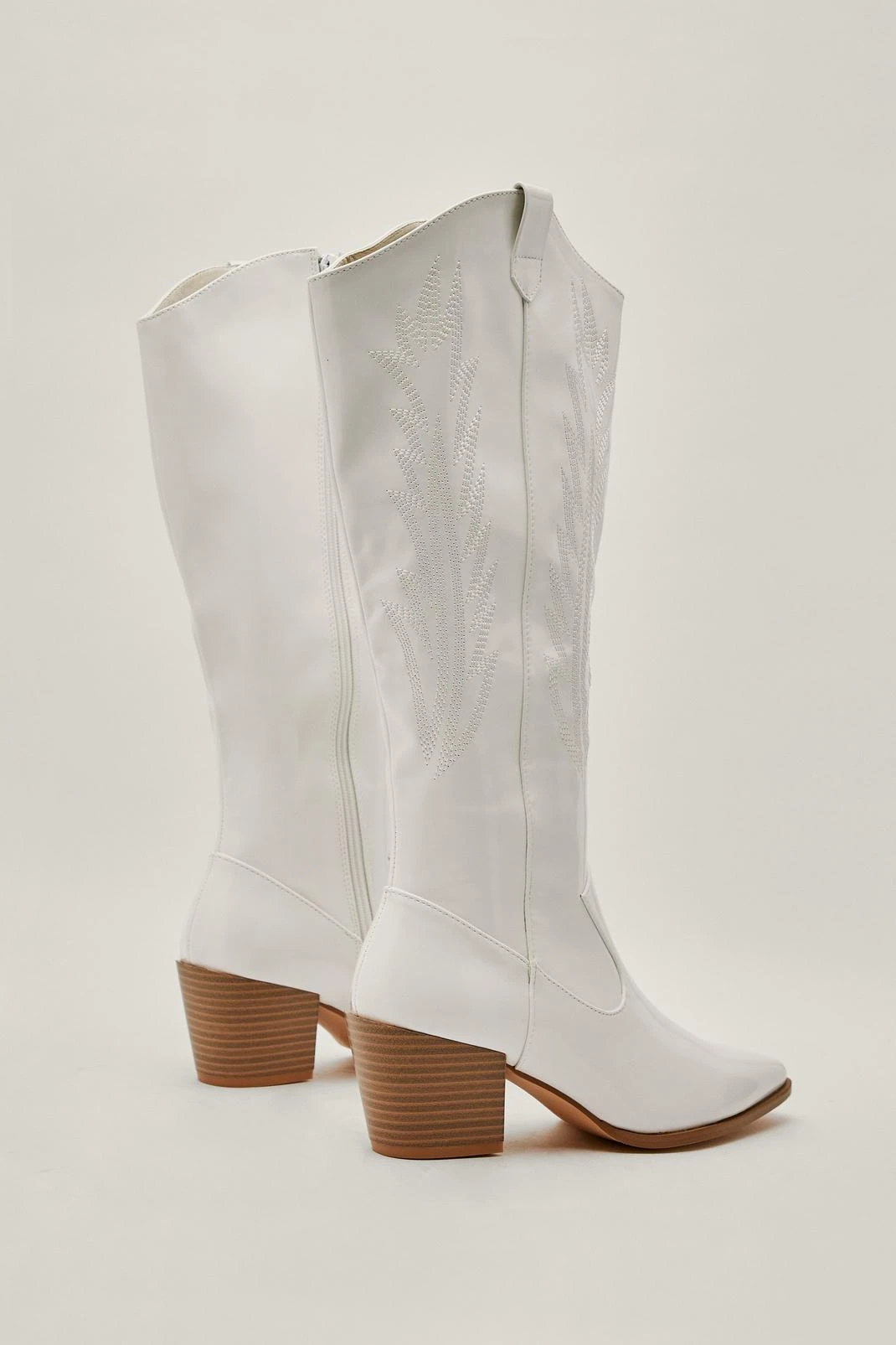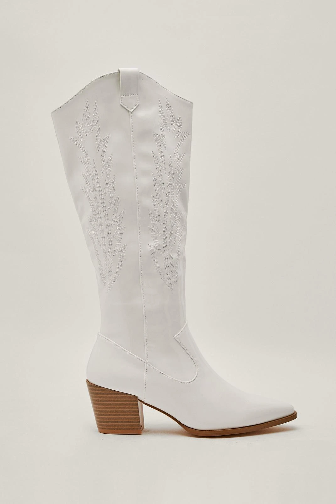 Easy there, cowboy. These western-style boots come in flexible faux leather and feature a knee-high silhouette, pointed toe, flat sole, slanted heel, western-inspired embossed design throughout, heel pull tabs, and inside zip closure. For a dialed-down look, pair yours with your favorite skinny denim jeans and a chunky cable knit sweater.
