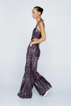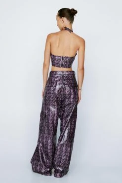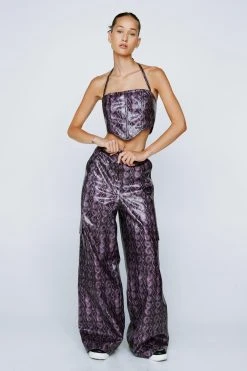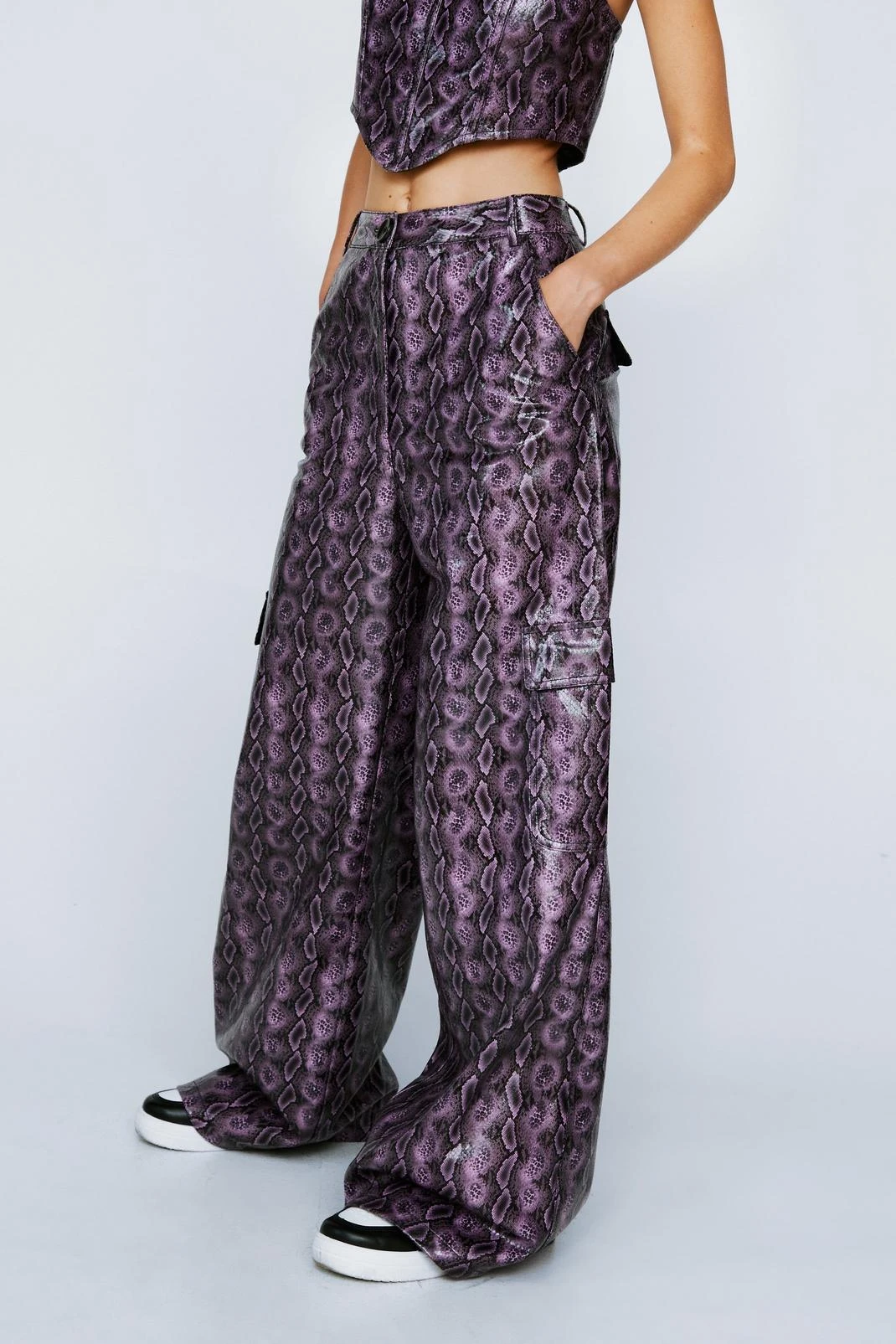 No snakes allowed. Feel fierce in our faux leather pants, made in high quality faux leather, with a fun snake print, and a flattering wide leg fit. Style with a crop top or corset top for an elevated look which will take you from festival weekends to date nights and happy hours.