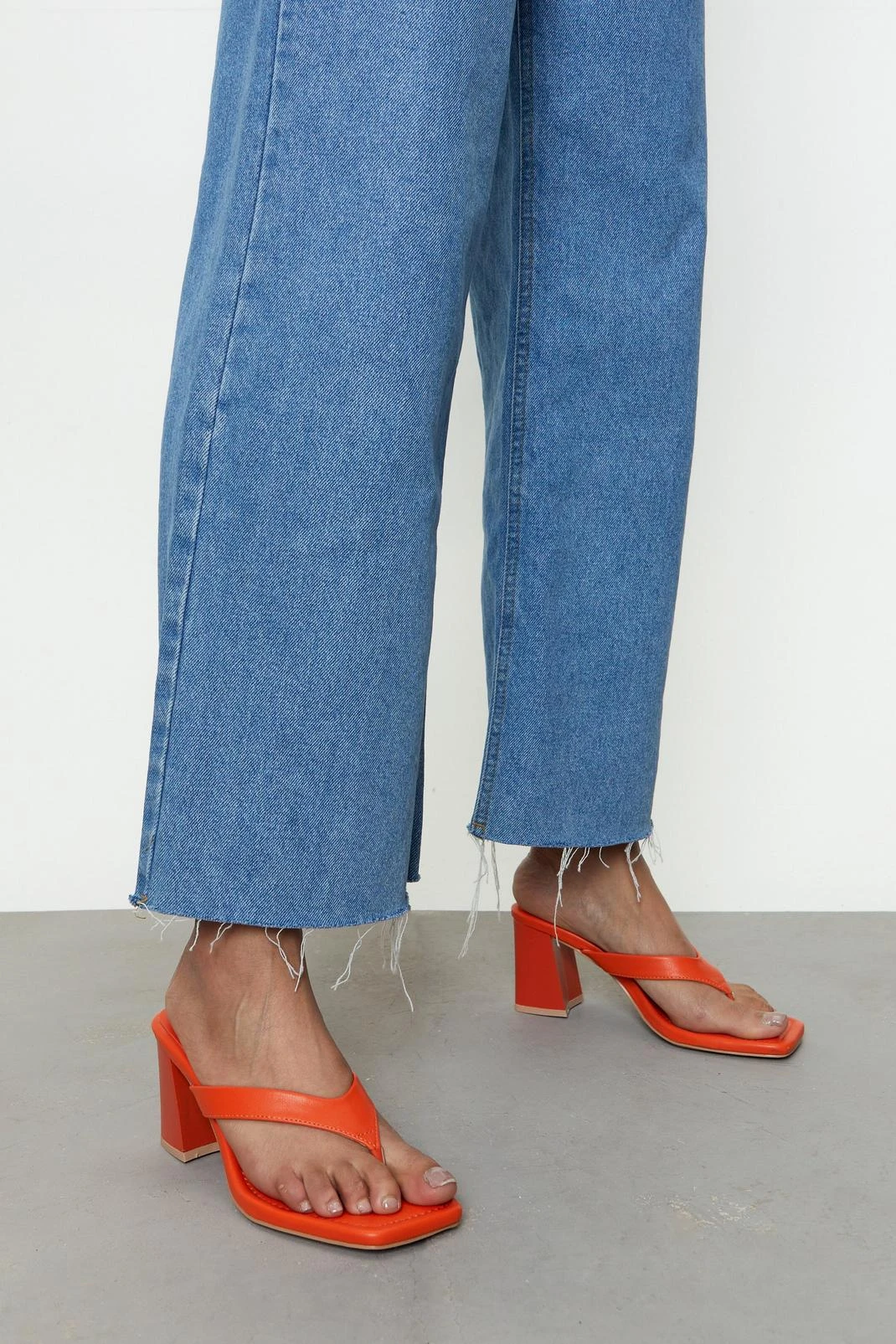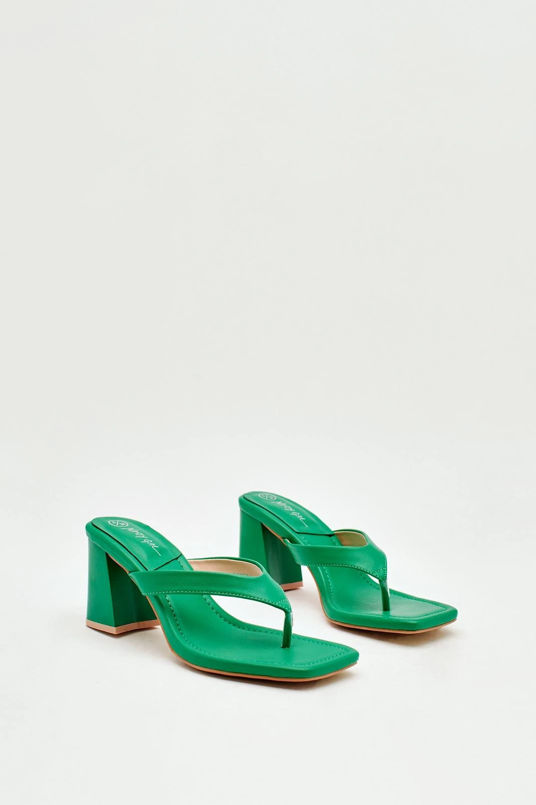 In your stride. These shoes feature a thong design, square toe, and exposed heel. Pair with a tailored suit co-ord for an elevated going out look.