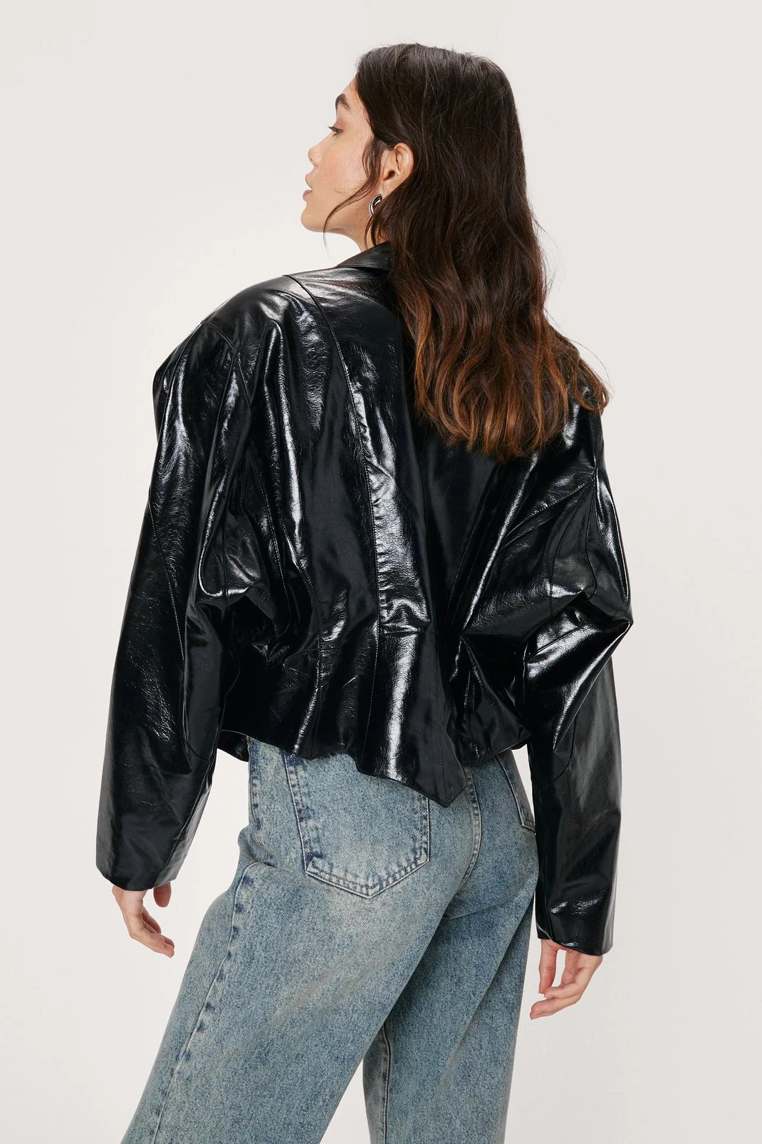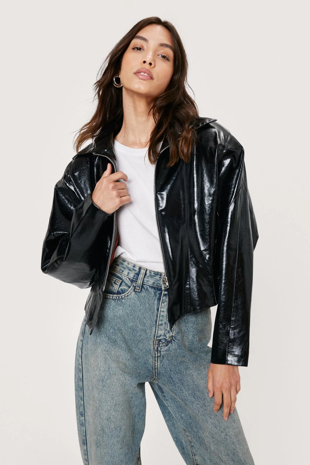 Get on your bike. This biker jacket comes in faux leather and features a boxy, oversized silhouette, pointed collared neckline, zip-down closure throughout front, long sleeves, and corset-style hemline. This is the crucial everyday essential you need to throw over jersey crew neck T-shirts.
