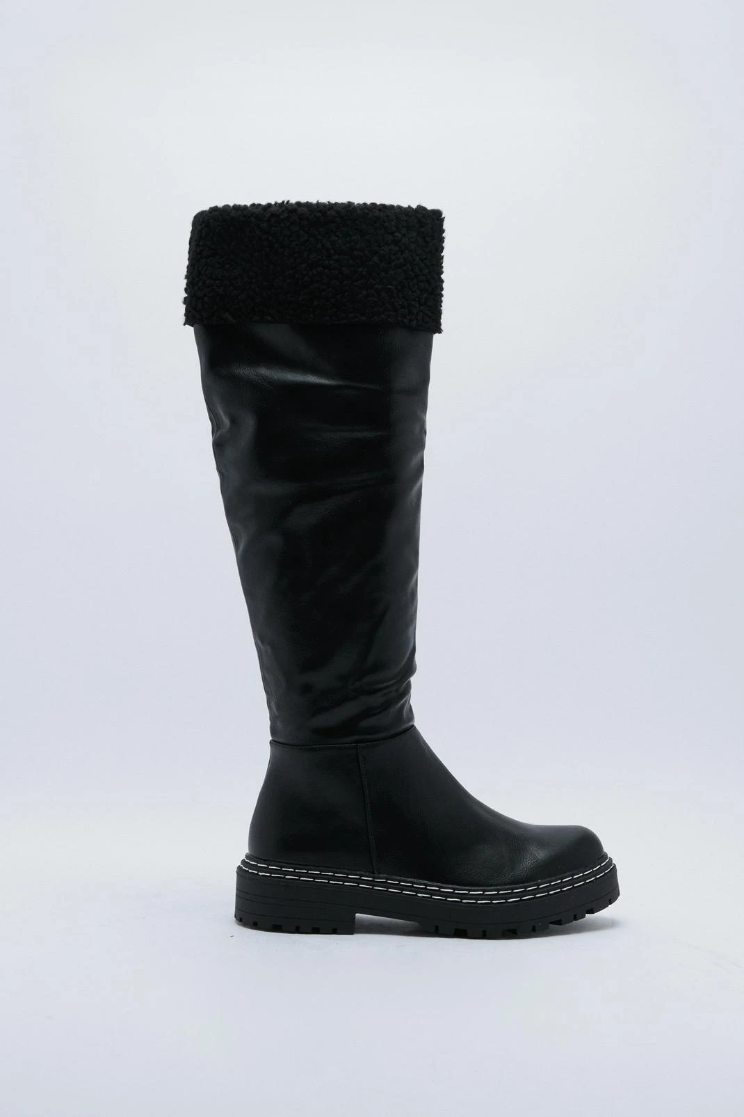 Made for walking. Feel ready to seize the day in our knee high boots, with high quality faux shearling fabric, contrasting stitch details, comfortable thick soles, and an easy inner ankle zip fastening. Pairs well with skirts and shorts for an elevated daytime look, perfect for festival weekenders to wintery walks.