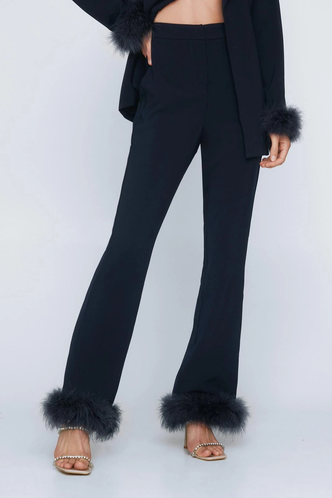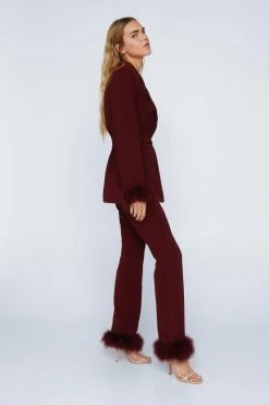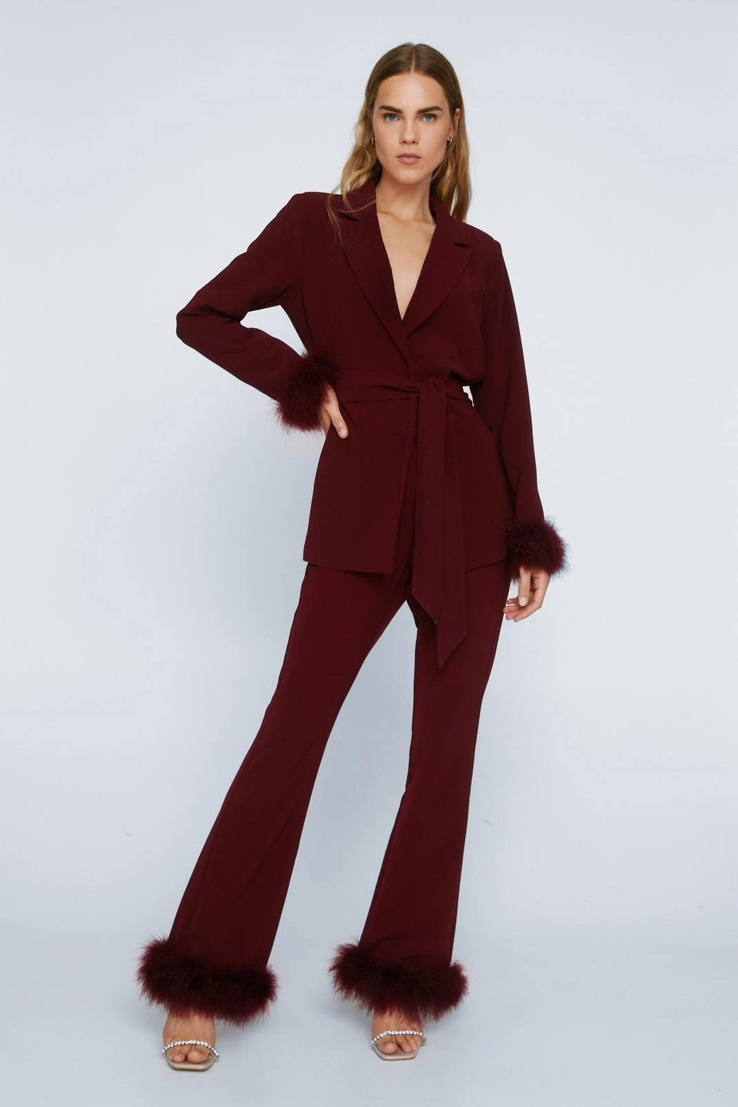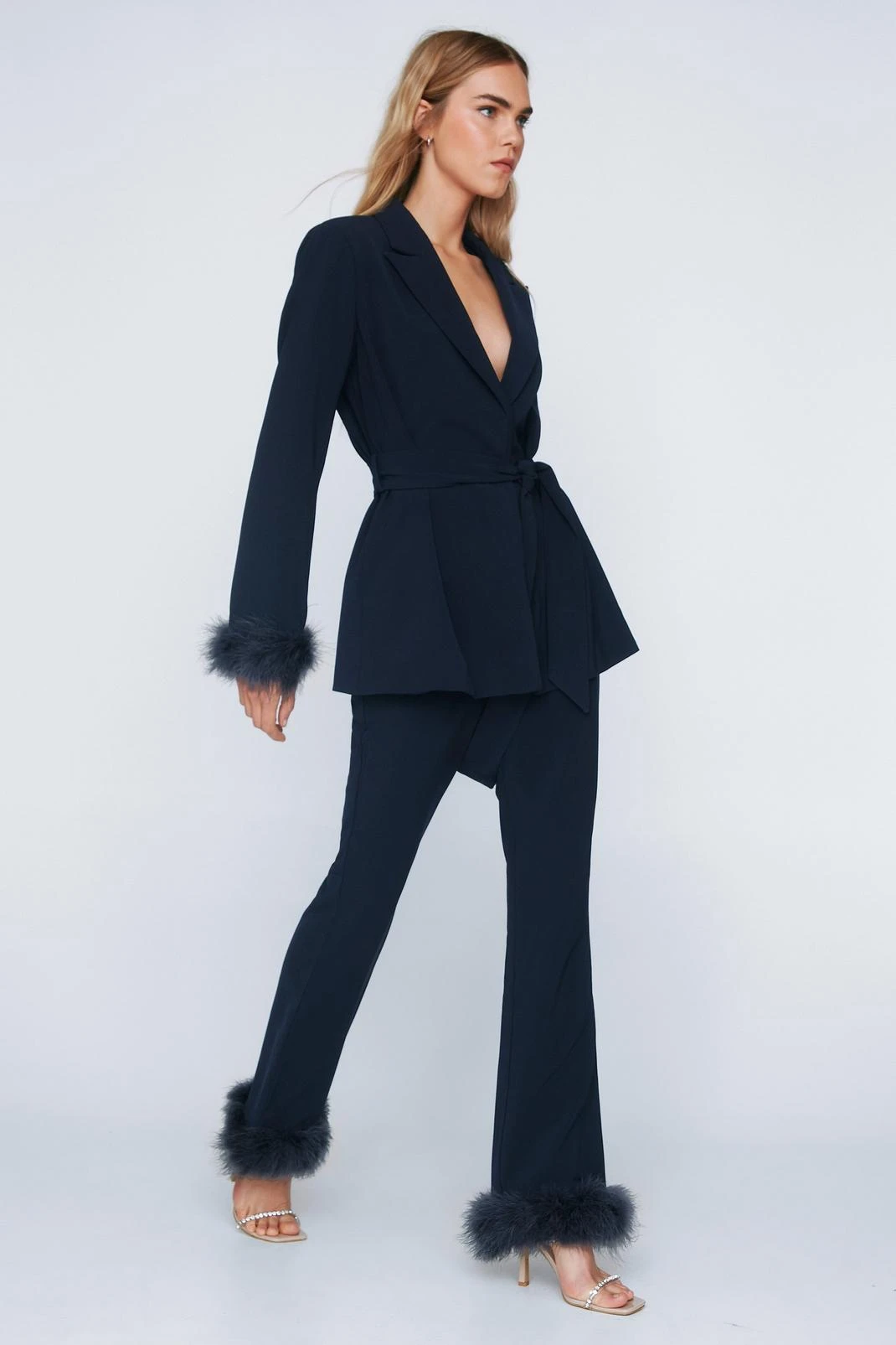 Ruffle some feathers. Our flared pants with feather trims can be styled with the coordinating blazer and strappy heels for party season and beyond.