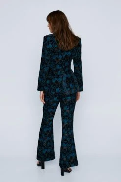 Add some flair. Feel formal and femme in our tailored flare pants, with a textured devore fabric, intricately detailed floral pattern, and comfortable high waist design. Pairs well with the matching blazer for a coordinating evening look.