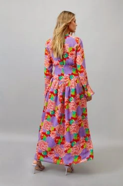 All dressed up. Feel cute in our floral maxi dress, with a fun and colorful pattern. The dropped waist creates a bodice that hugs the figure, white the flared sleeves and flowy skirt offer a relaxed contrast. Pairs well with boots or heels for an instant occasion look.
