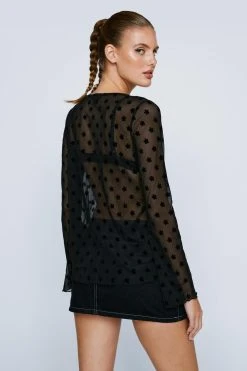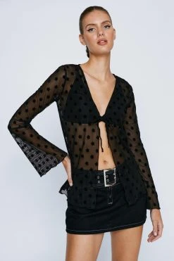 See it through. Our mesh tie detail top features a floral polka dot pattern and tie front feature.