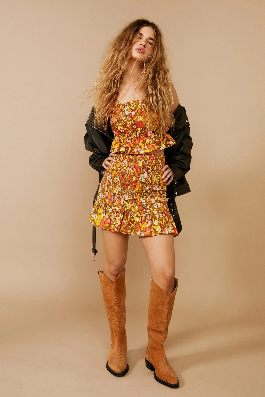 - Floral Shirred High Waisted Mini Skirt