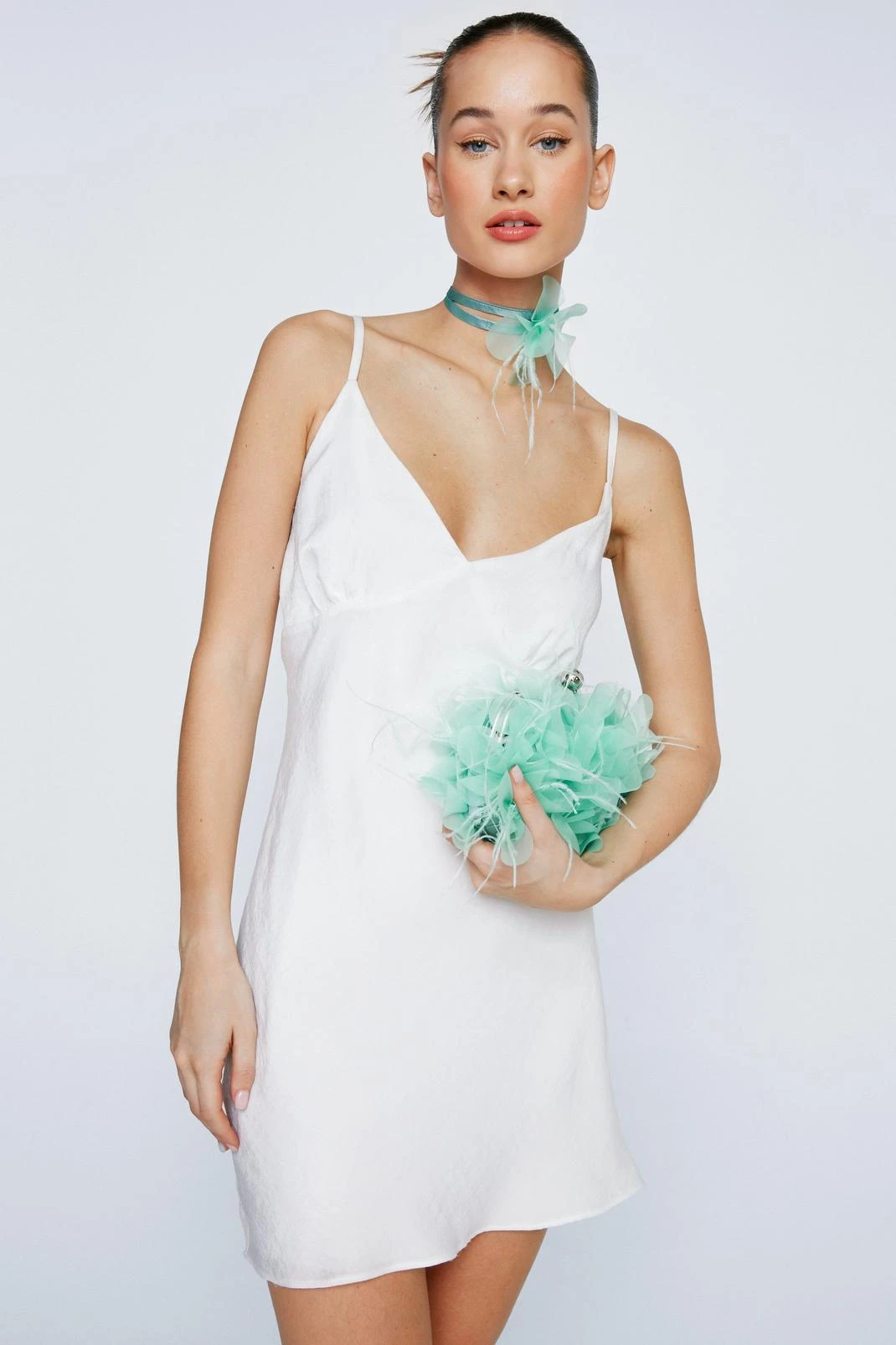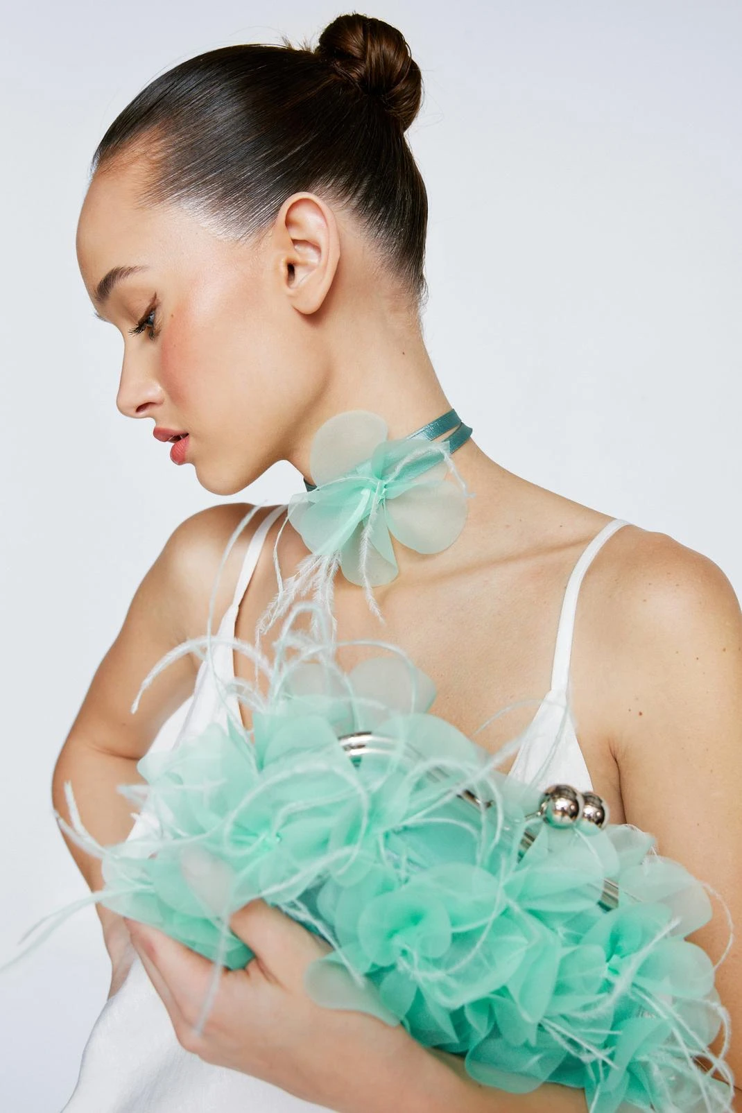 Bring flowers. Feel fancy in our bag and necklace set, with statement textured flower detailing, and soft feather accents. Pairs well with your fave occasion looks to perfectly finish your wedding guest look, party outfit, or Valentine’s date night outfit, and can be worn to all of your upcoming occasions.
