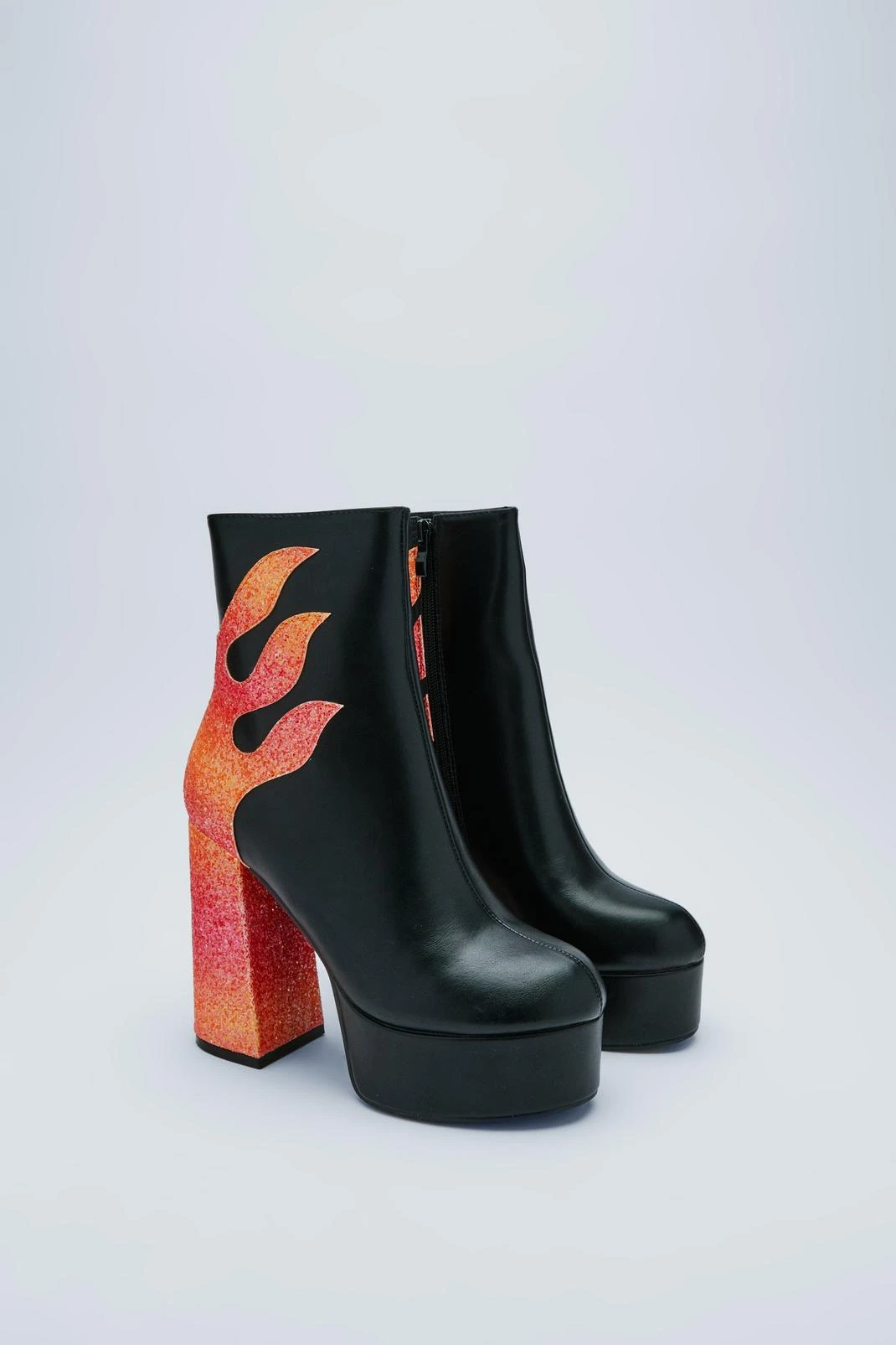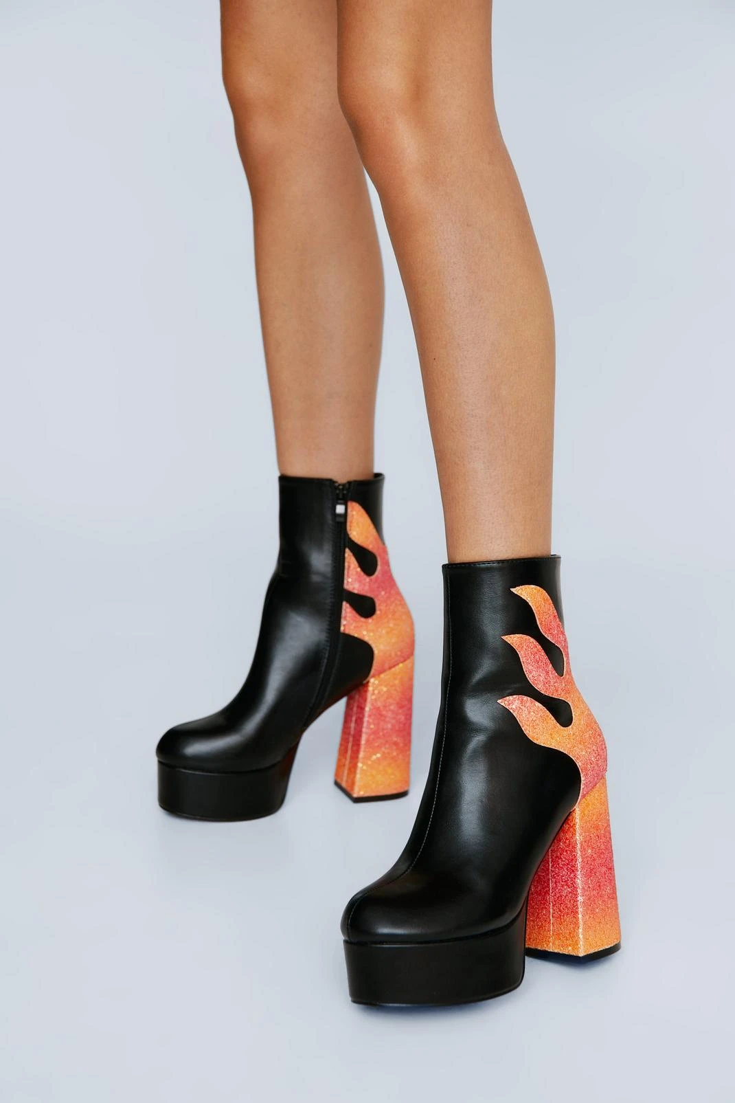 You’re on fire. Make your footwear a focal point with our iconic glitter flame platform boots.