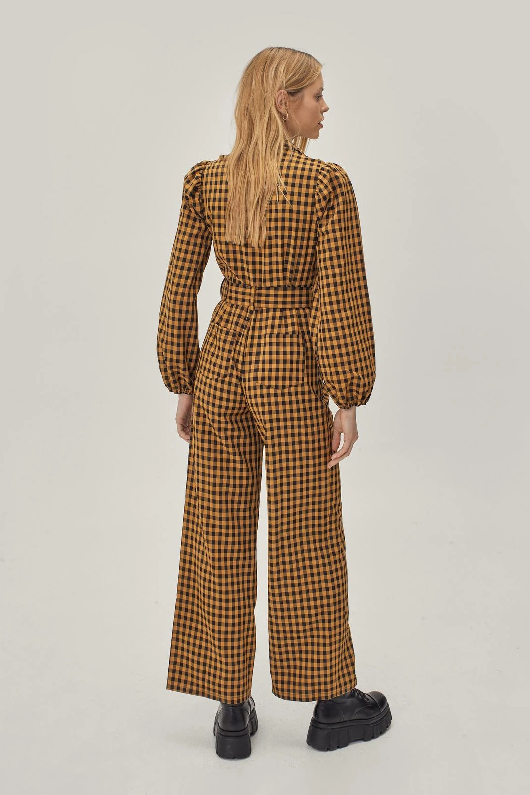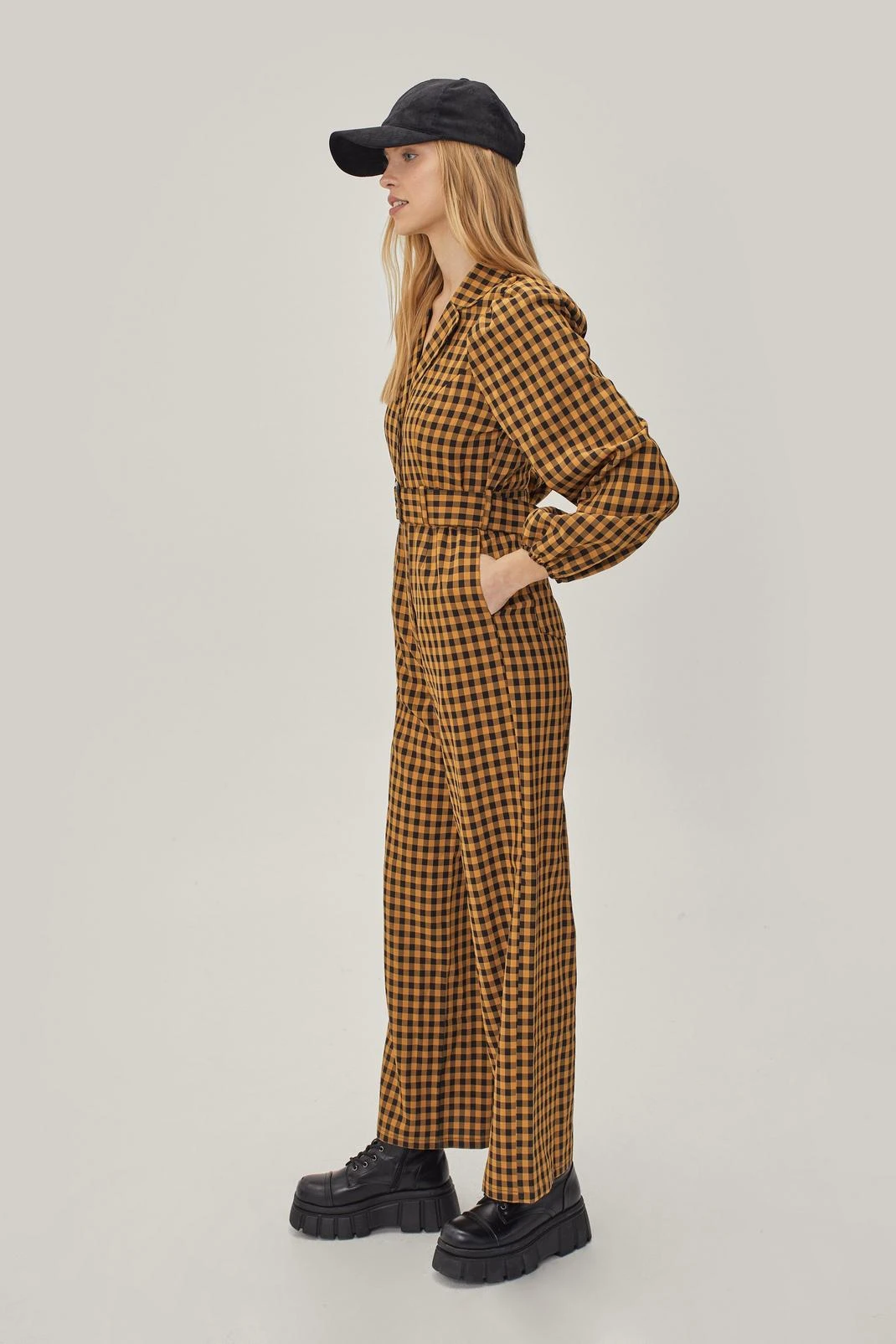 Checking you out. This jumpsuit features a V neckline, relaxed, full length silhouette, balloon sleeves, elasticized cuffs, zip closure, belt with buckle closure, and check print throughout. Style yours with chunky biker boots.