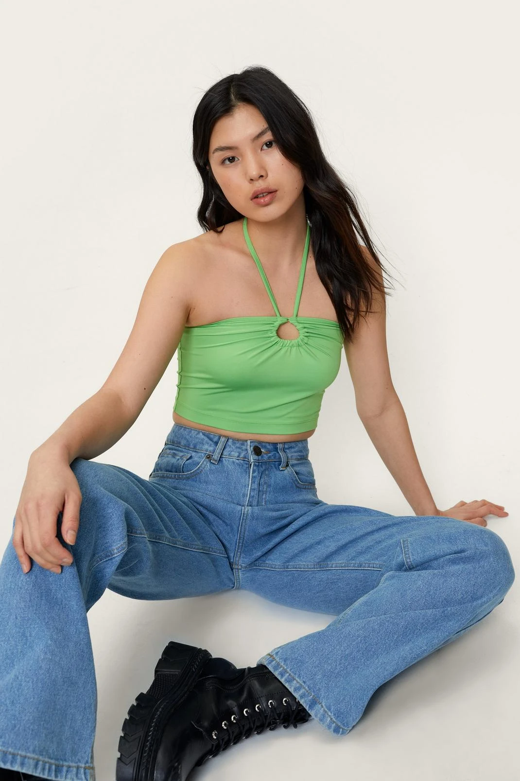 Get on top. Team this halter neck crop top with high waisted jeans and chunky biker boots.