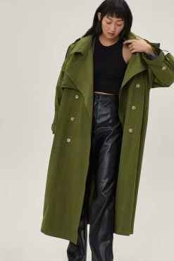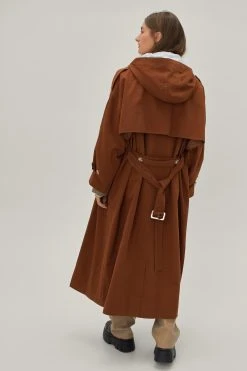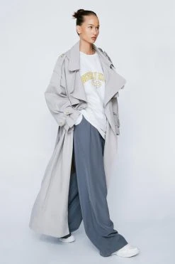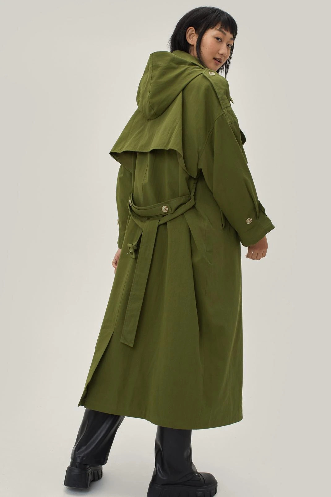 Am I the answer to your layers? This trench coat features an oversized, longline silhouette, V neckline, wide, notched lapels, drop sleeves with fitted cuffs, double breasted button closure, layered design at top, pockets at sides, tie belt at waist, and hood at back. Rad for throwing on over suiting sets, mom jeans and that 4 year old sweat set.