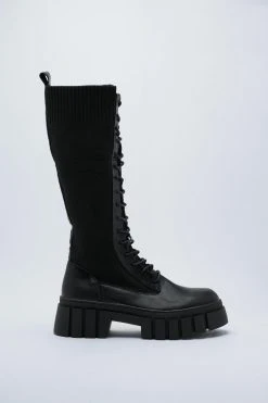 Stomping ground. These boots feature a slim-fitting design, chunky cleated heels, and lace up fronts.