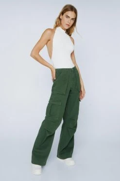 Show a little side boob. This bodysuit comes in knit and features a high leg, halter silhouette, open back, high neck, medium bottom coverage, and snap closures at crotch. Model is 5’9″ and wears a US size 6/UK size 10.