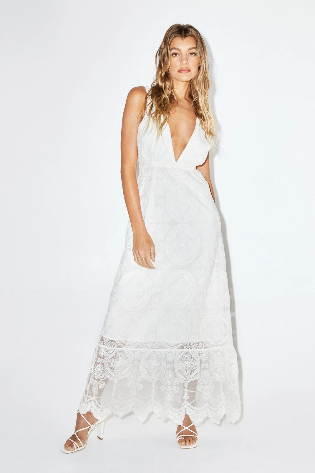 A moment for the dress. Feel femme in our lace maxi dress, with high quality embroidered fabric, a statement V back, and a dramatic plunge neckline. Pairs well with sandals and minimal jewellery for a laidback and unique wedding or prom look.