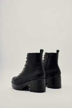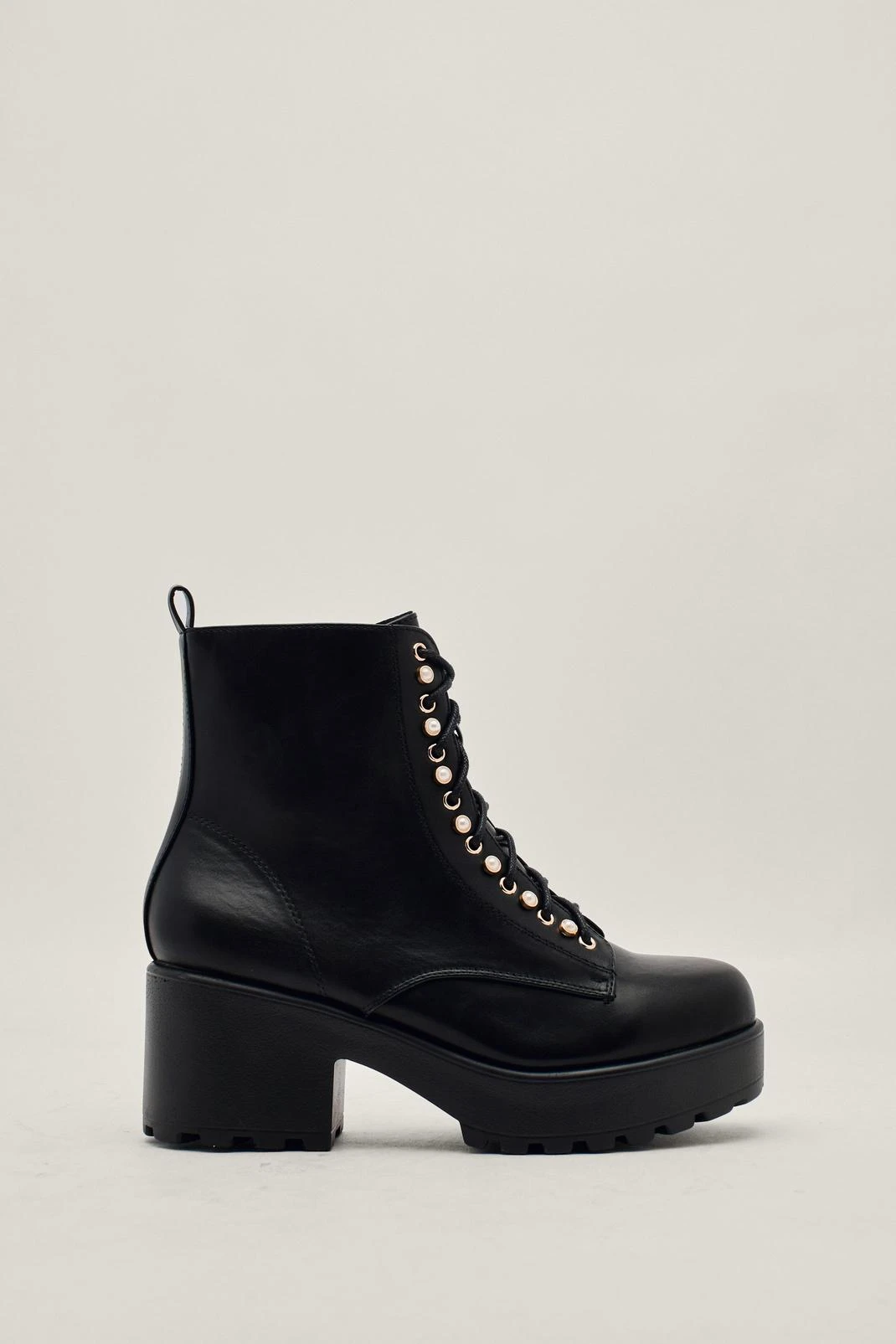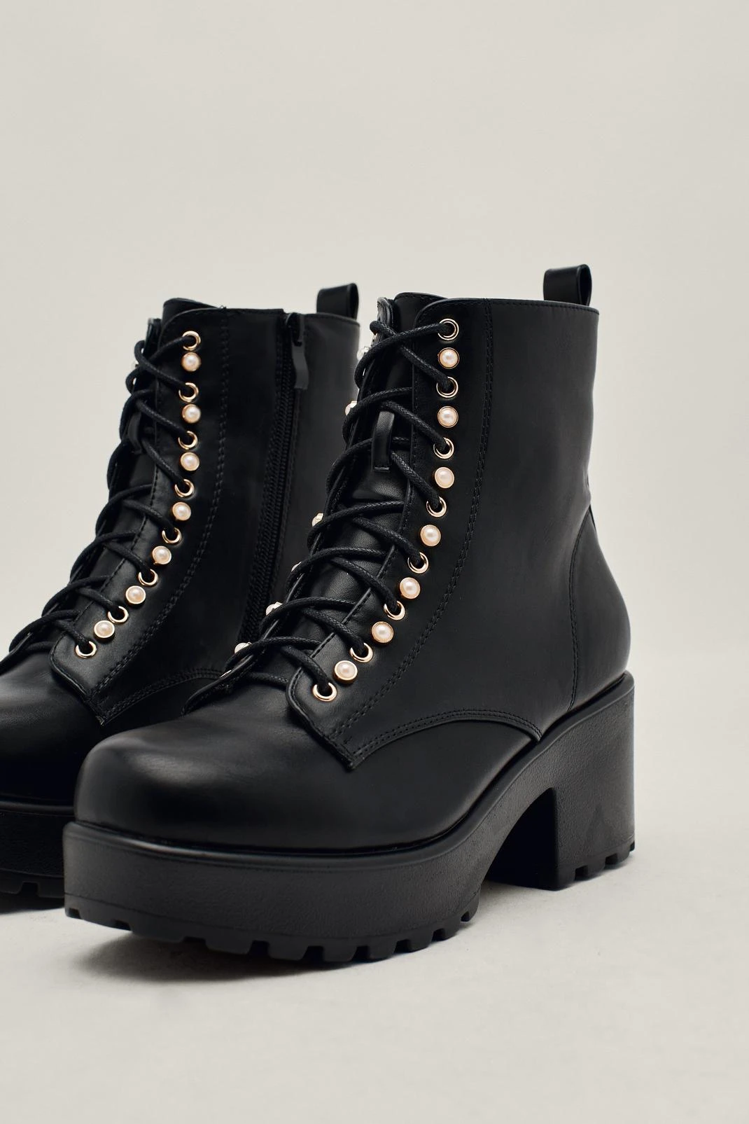 It’s a lot to process. The Has It Chunk In Yet Boot comes in faux leather and features a round toe, platform, tread sole, block heel, pearl-inspired embellishment at front, lace-up closure, and inside zip closure.