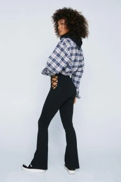 Laced up. Feel confident in our flare pants, which feature lace up hip detailing and an ultra flattering flared fit. Pairs well with a crop top and bomber jacket for an elevated daytime look, perfect for brunch dates and happy hour catch ups.