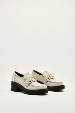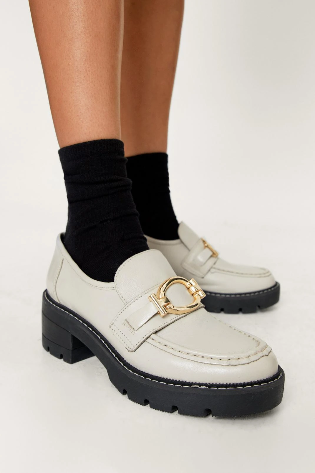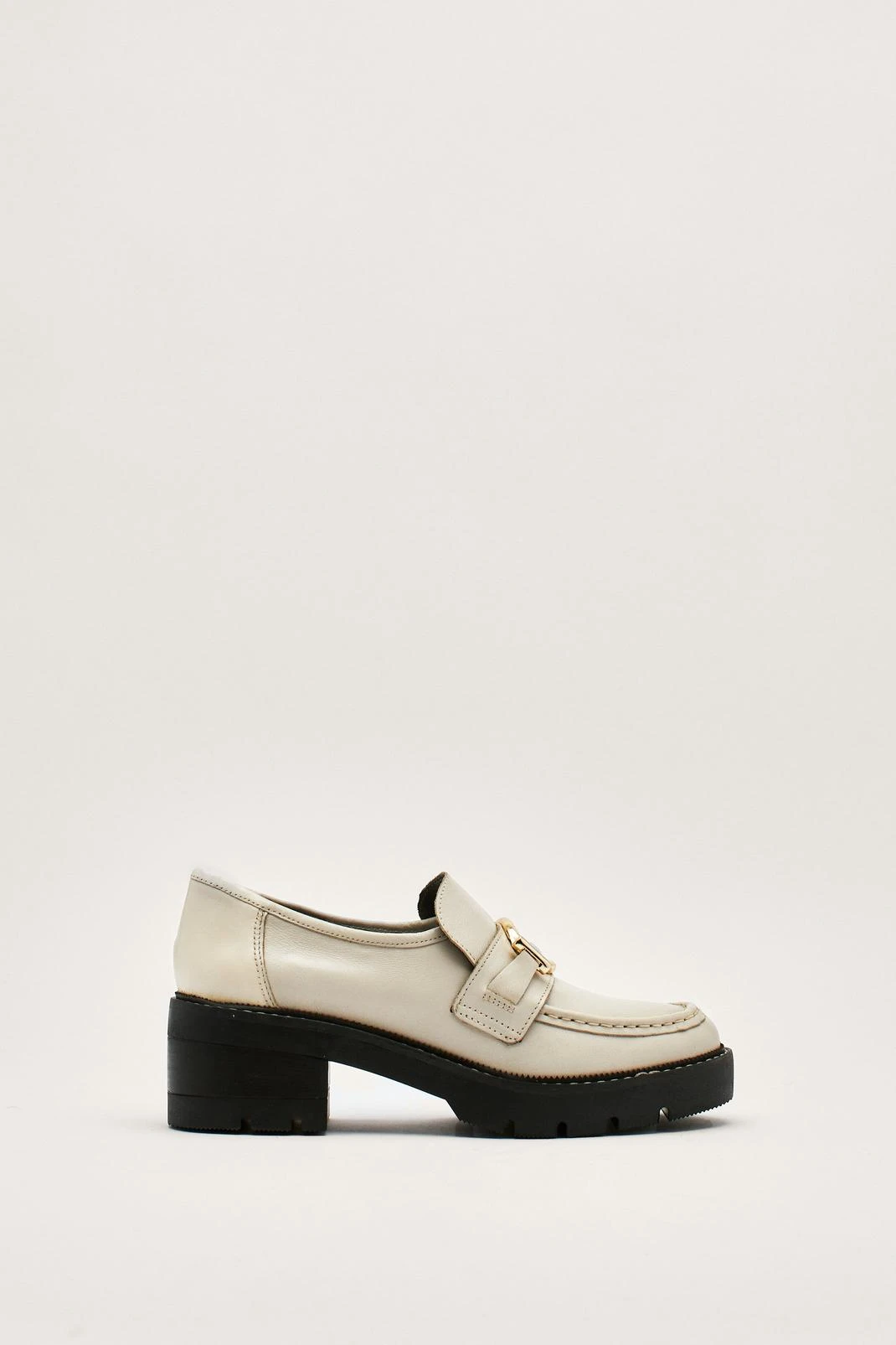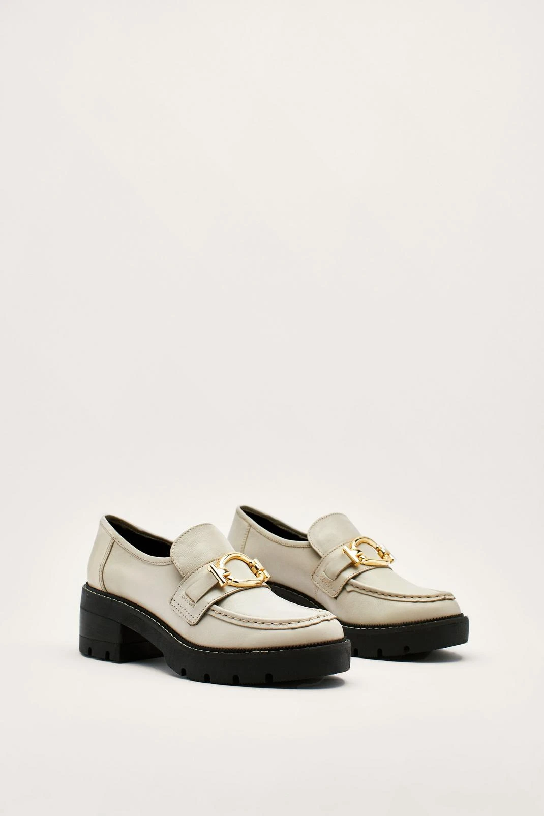 Step to it. These shoes have a loafer design, chunky heels, and large frame buckle details. Pair with socks, and a leather co-ord for drinks after work.